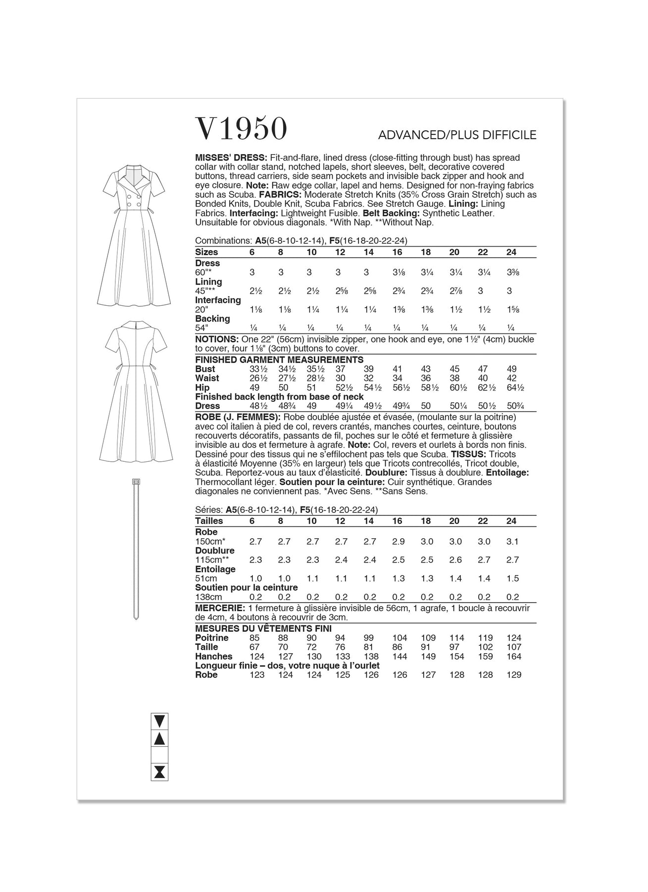 Geeignet für nicht ausfransende Stoffe wie Scuba. STOFFE: Mäßig dehnbare Maschenware (35% Cross Grain Stretch) wie z.B. Bonded Knits, Double Knit, Scuba Fabrics. Siehe Stretch Gauge. Futterstoff: Gefütterte Stoffe. Einlagen: Leichtes Fixiermaterial. Gürtel-Unterlage: Synthetisches Leder. Nicht geeignet für offensichtliche Diagonalen.