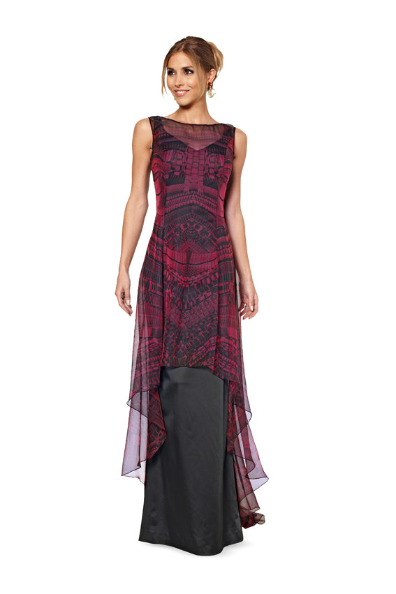 Abendkleid - Überkleid - transparent Schwierigkeitsgrad: mittel Gr. 36, 38, 40, 42, 44, 46, 48 Elegantes Abendkleid mit schönem Dekolleté, auch im Rücken, in körpernaher, zum Saum ausgestellter Silhouette. Einzeln betrachtet ein Eyecatcher. Mit den transparenten Überkleidern, entweder ärmellos oder mit ¾ Ärmeln, können Sie seine Wirkung verändern. Machen Sie die Probe aufs Exempel. Gürtel mit Stoffrose aus demselben Stoff betonen die Taille.
