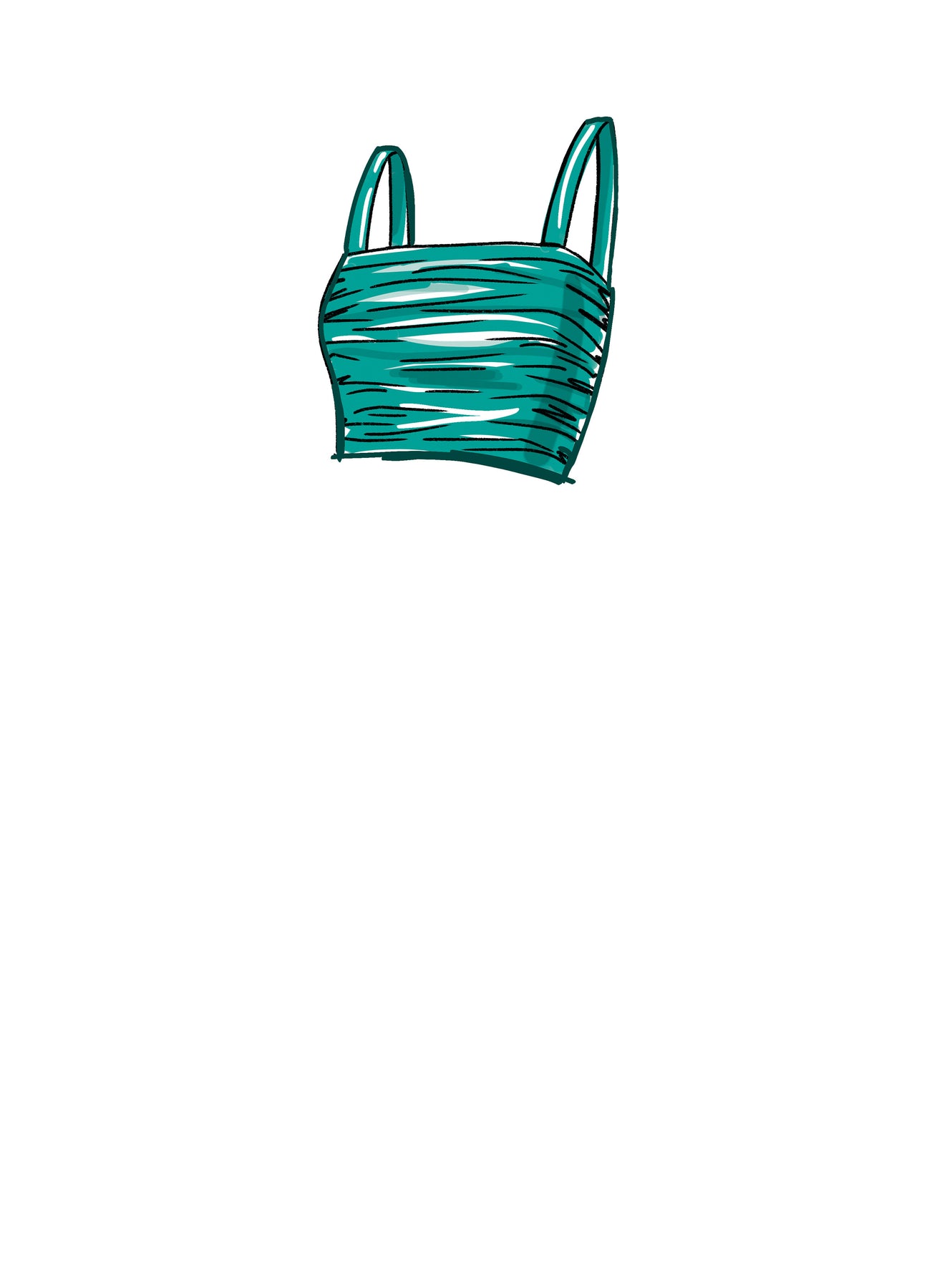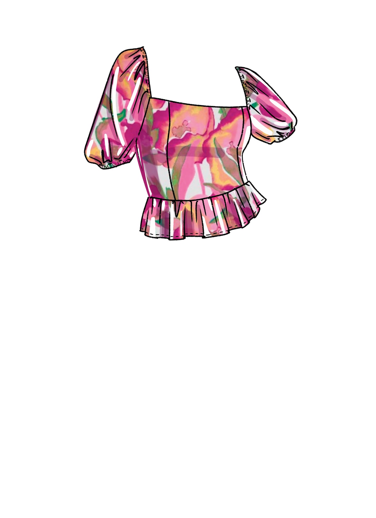 Das Crop-Top in Ansicht A hat ein gerafftes Mieder und Schulterträger. Ansicht B hat ein gerafftes Schößchen und elastische Puffärmel. Bei Ansicht C handelt es sich um ein Midikleid mit gerafftem Mieder, Puffärmeln und gerafftem Rockteil mit Rüsche. Bei Ansicht D handelt es sich um ein langes Kleid mit gerafftem Mieder und Schulterträgern, Knopfleiste und ärmellosen Optionen.