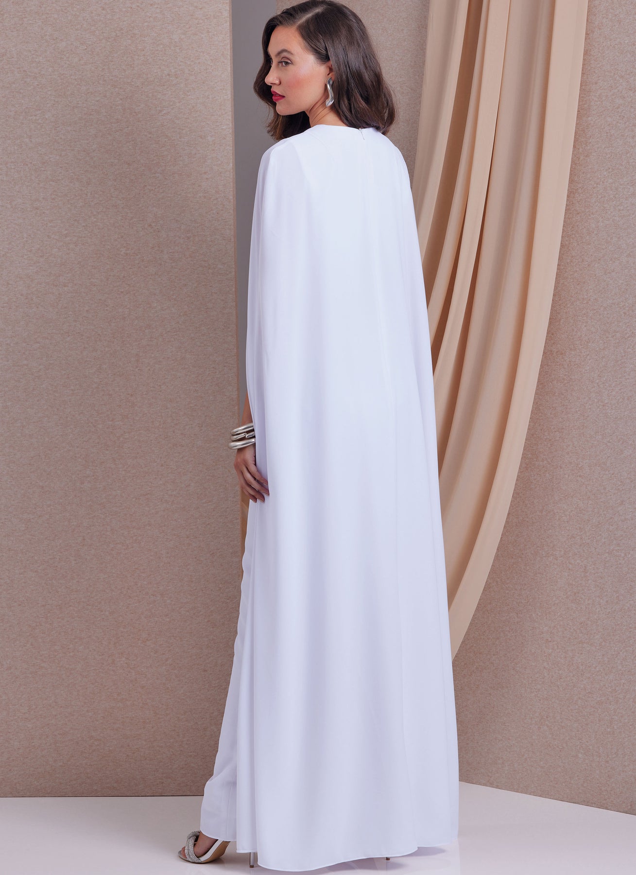 Das taillierte, gefütterte Cape-Kleid hat einen Juwelenausschnitt, Abnäher an Taille und Brust, Prinzessnähte hinten, einen Rückenschlitz und einen unsichtbaren Reißverschluss hinten. Der dazugehörige ungefütterte Umhang (die falsche Seite ist zu sehen) hat ebenfalls einen unsichtbaren Rückenreißverschluss und einen Babysaum. Ansicht A hat 3/4 lange Ärmel. Ansicht B ist ärmellos