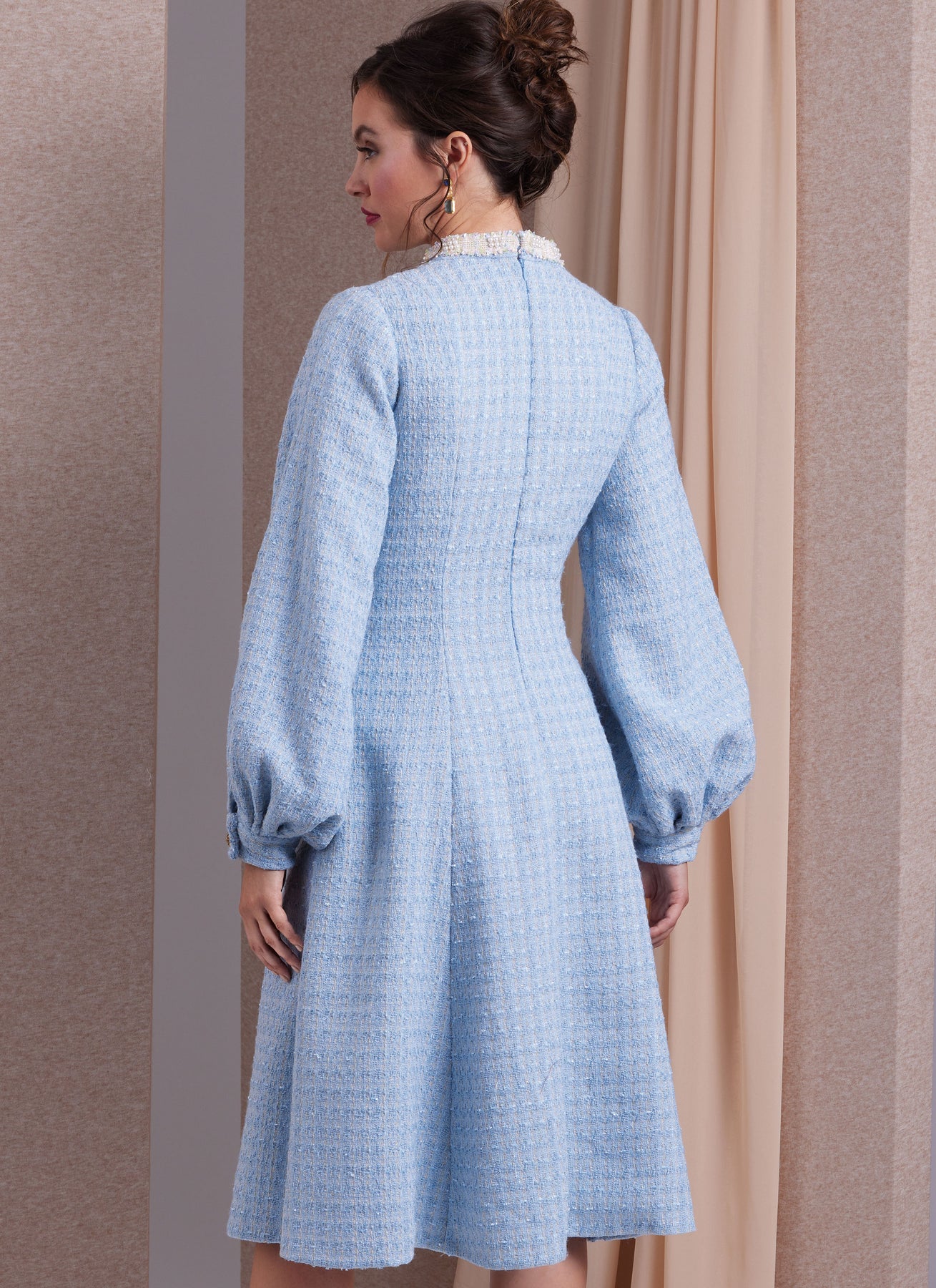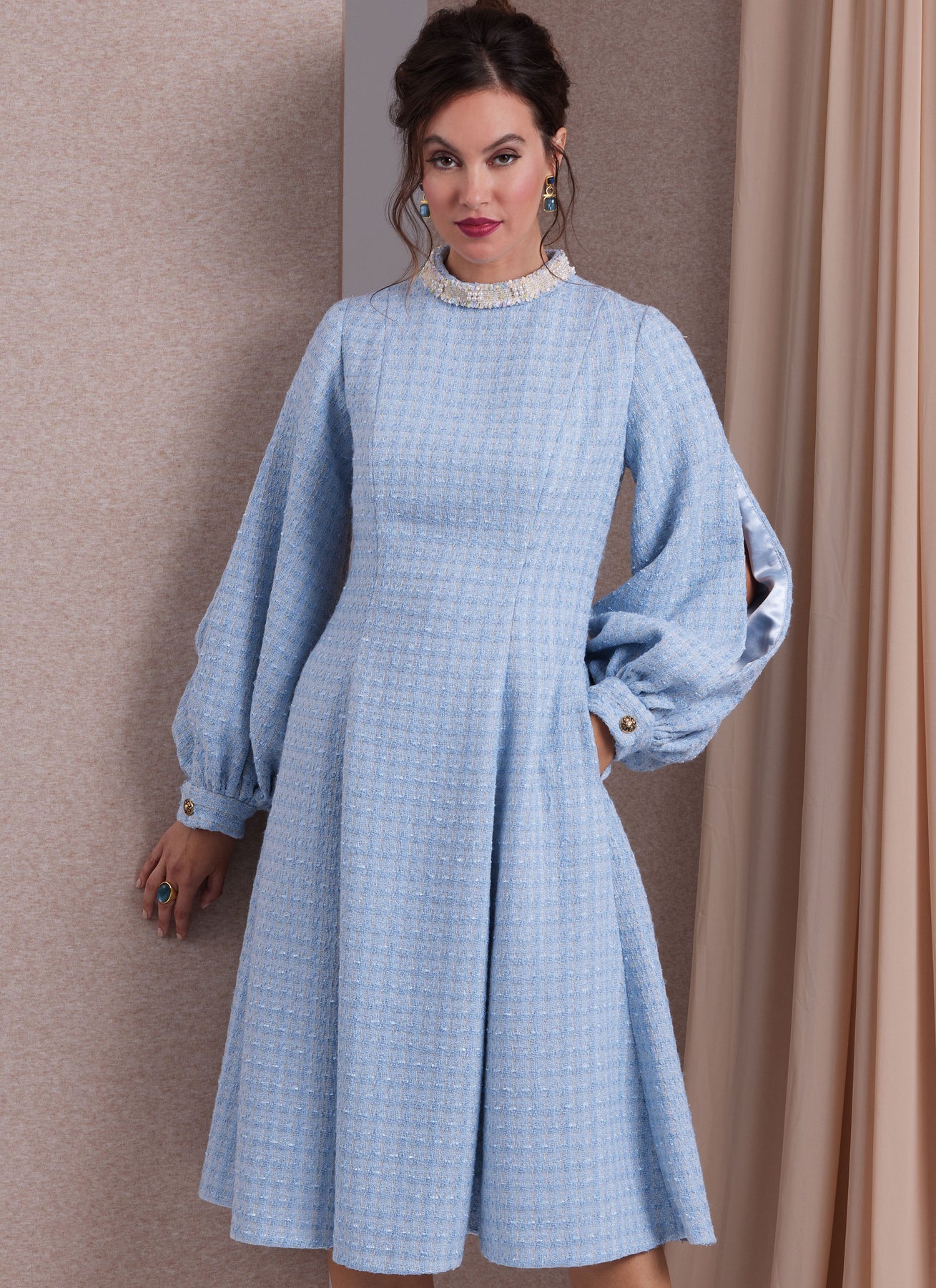 Kleider mit ausgestelltem Schnitt sind gefüttert und unterlegt. Sie liegen an Brust und Taille eng an, haben einen schrägen Stehkragen, Prinzessnähte, Seitennahttaschen, einen unsichtbaren Rückenreißverschluss, Haken- und Ösenverschluss und einen unsichtbaren Saum. Ansicht A hat lange zweiteilige Läuferärmel, die geteilt sind, so dass das Futter sichtbar ist, und in Knopfmanschetten enden, mit gekauftem Besatz am Kragen. Ansicht B hat lange Ärmel mit Manschetten.