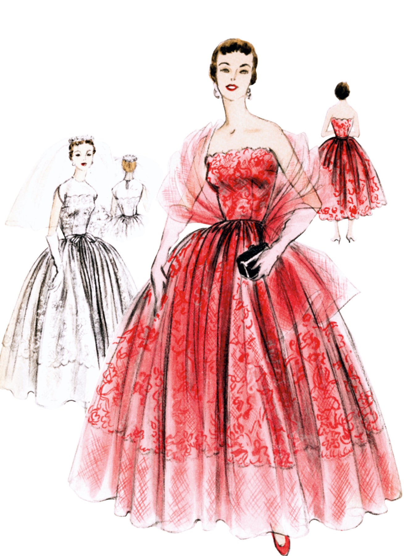 Vintage Vogue Patterns 1954 Abendkleid und Stola oder Brautkleid. Rundum geraffter Rock in zwei Längen, der an der Taille in das nackte Oberteil übergeht. Separates Untermieder mit kragenlosem Rundhalsausschnitt und Flügelärmeln. Stola im Schnittmuster enthalten. Authentische Vintage-Reproduktion mit zusätzlichen Größenoptionen und Schnittmustern.