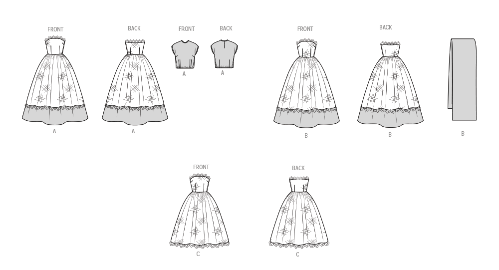 Stoffempfehlung:Mieder und Rock A,B,C: Rüschenbesatz, Spitze, Stickereirand. Untermieder und Rockband A, Stola und Rockband B: Organdy, Netz. Futter: Futterstoff.