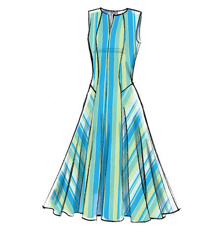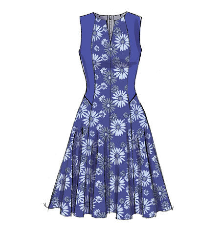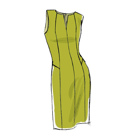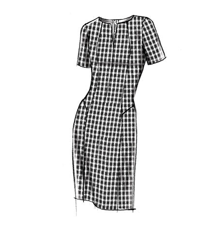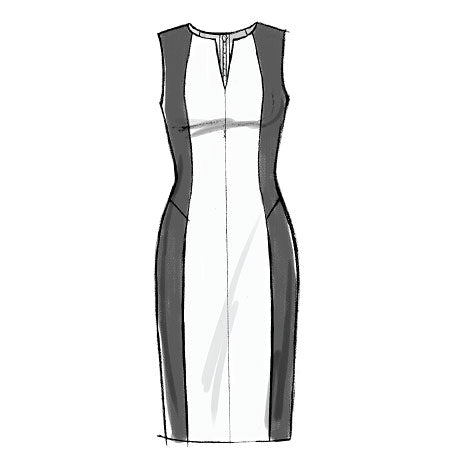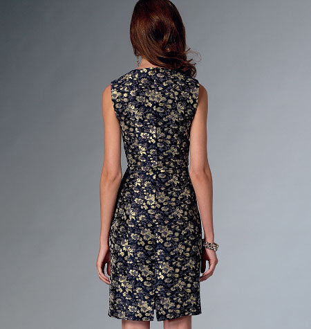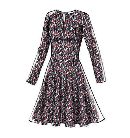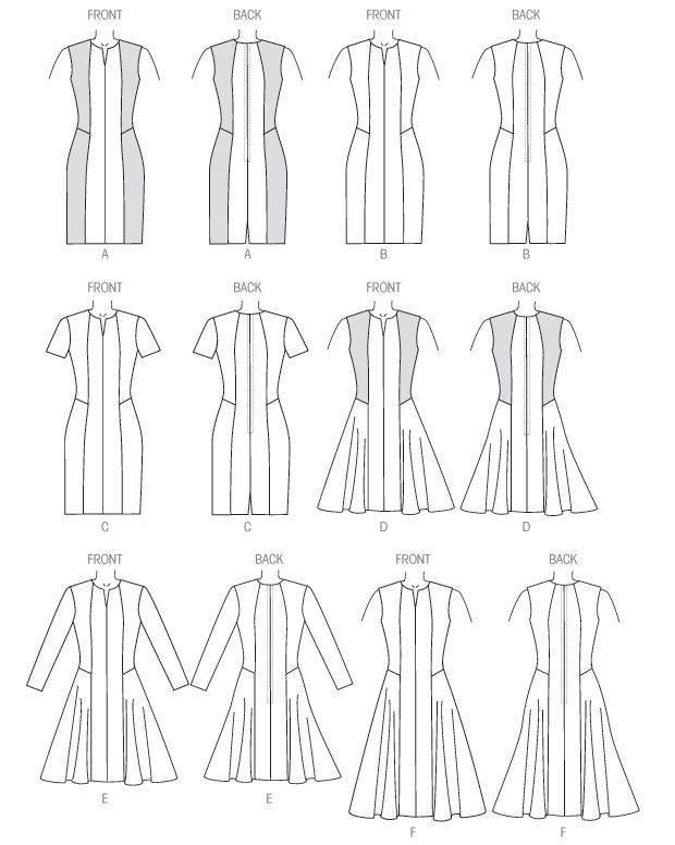 Gefüttertes Kleid (im Brustbereich eng anliegend) mit Nahtdetails und Rückenreißverschluss. A, B und C: halb tailliert im Hüftbereich und mit Rückenschlitz. C und E: zweiteilige Ärmel.