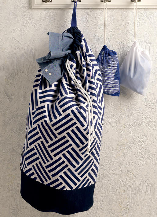 Laundry Bag A is fully lined, with a drawstring closure and purchased webbing for strap. Drawstring Bag B can be used for washing lingerie or to store valuables.