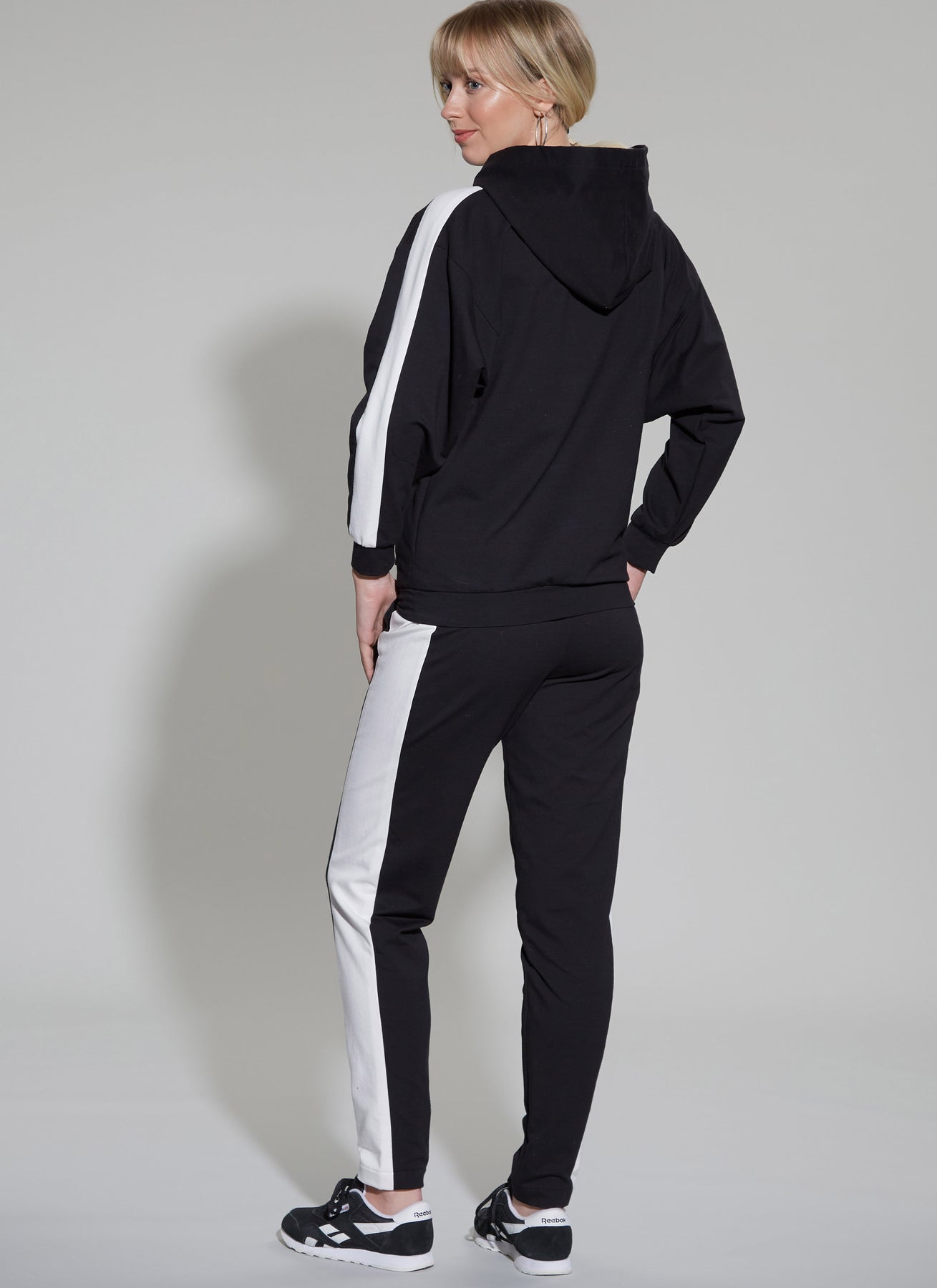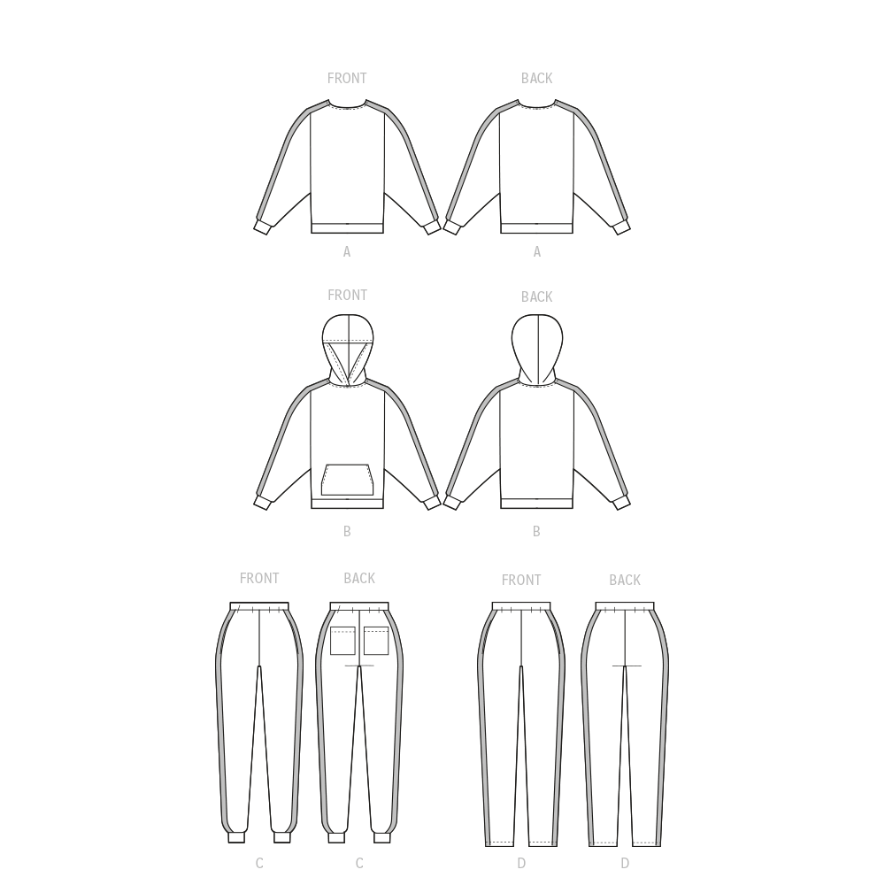 Bequemes Lounge-Set mit kontrastierenden Seiteneinsätzen an Oberteil, Kapuzenpulli und Hose. Ansicht A hat ein Schrägband zum Abschluss des Halsausschnitts. Ansicht B hat eine Kapuze und eine Kängurutasche. Die Loungehosen C und D haben Seitentaschen und einen Gummizug im Bund. Ansicht C hat aufgesetzte Rückentaschen und Bündchen.