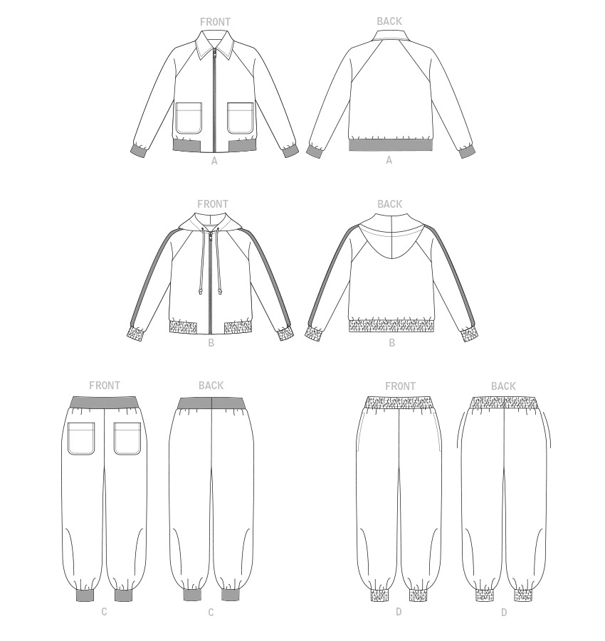Die halb taillierten Jacken für Damen haben teilbare Reißverschlüsse und Raglanärmel. A: Kontraststreifen, spitzer Kragen. B: Kapuze mit Kordelzug, Ripsbandbesatz an den Ärmeln. Hosen zum Anziehen, halb tailliert in der Hüfte, knöchellang, Taschenvarianten. A, C: kontrastierende Bänder. B, D: elastische Bänder.