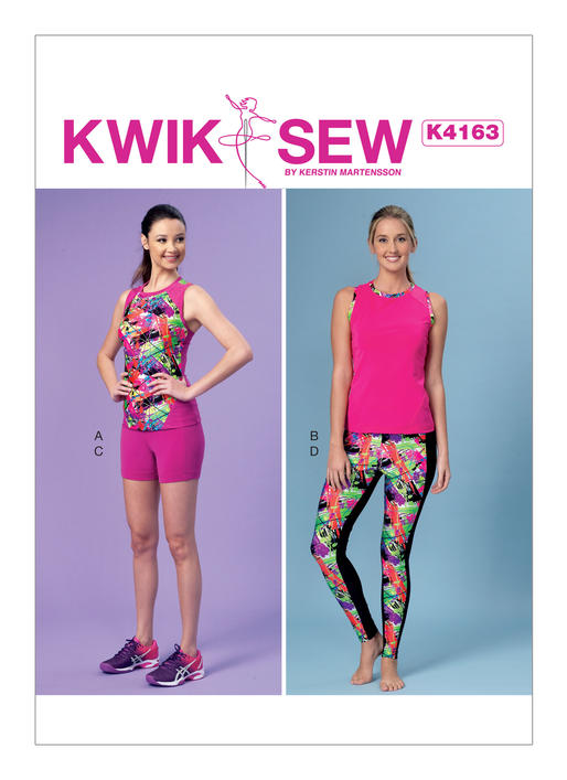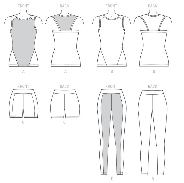 Pullover tops have a round neckline with neckband, front seam detail, racerback yoke and armhole bands. Shorts and ankle-length leggings have front seams, no side seams and wide waistband with elastic. Top A: Contrast front and back yoke. Top B: Contrast neckband and armhole bands. Leggings D: Contrast fronts.