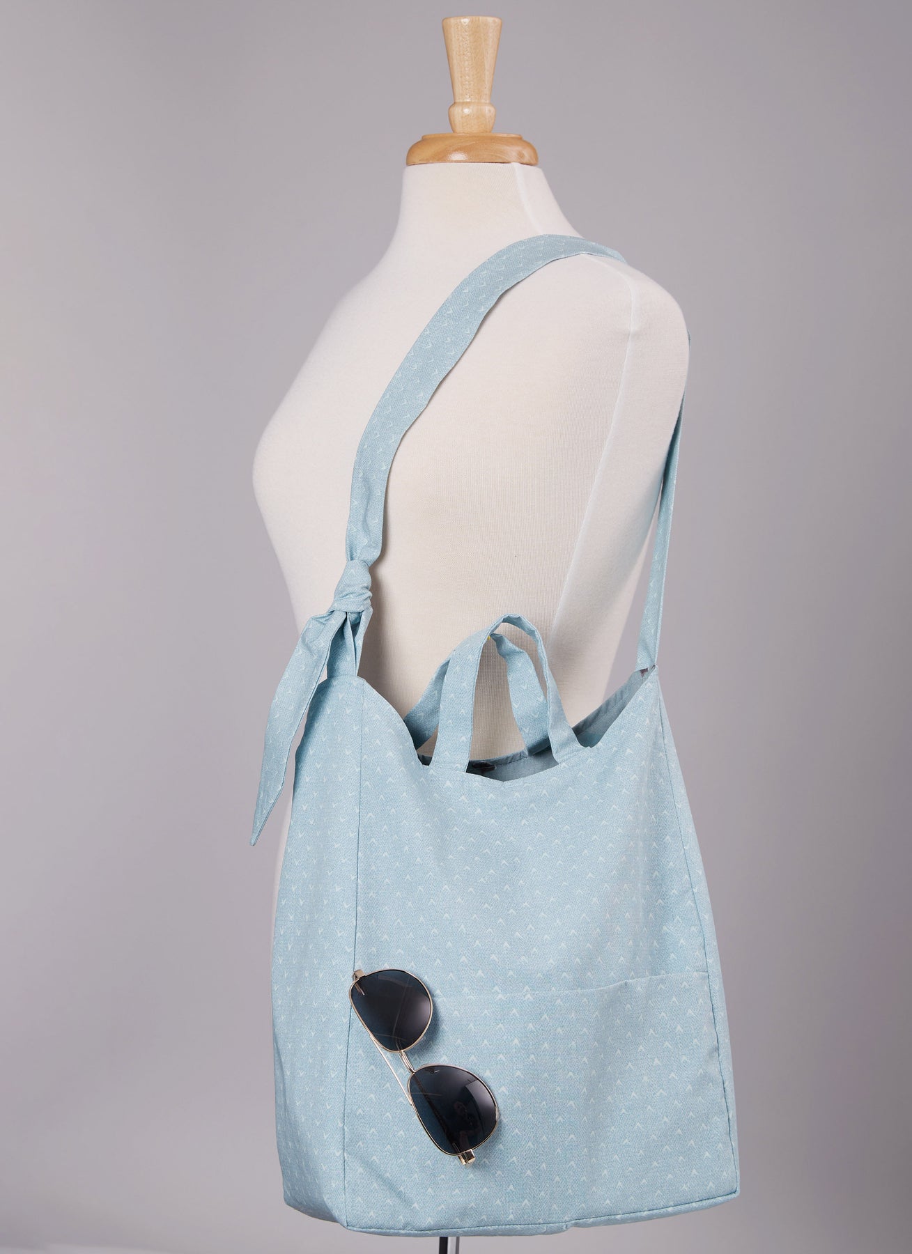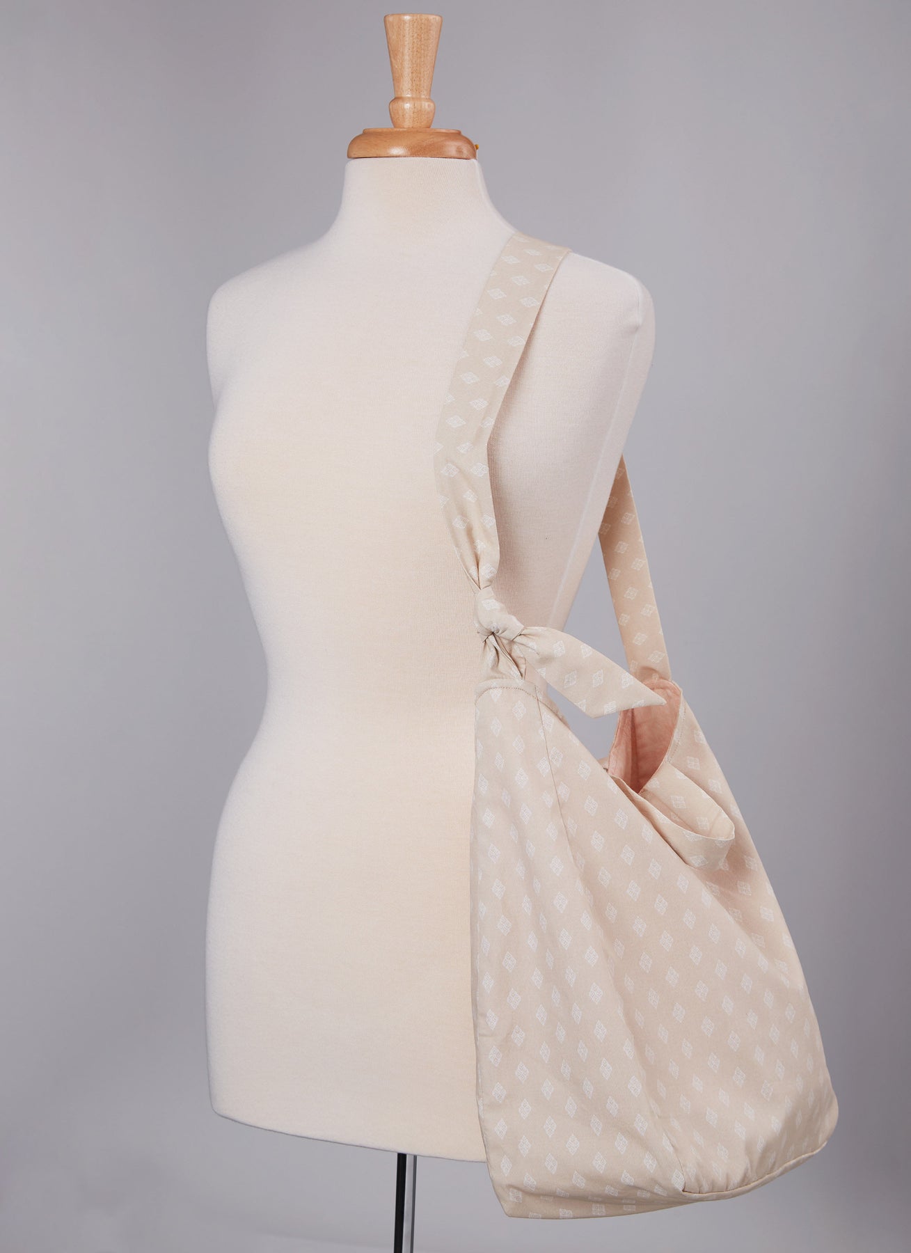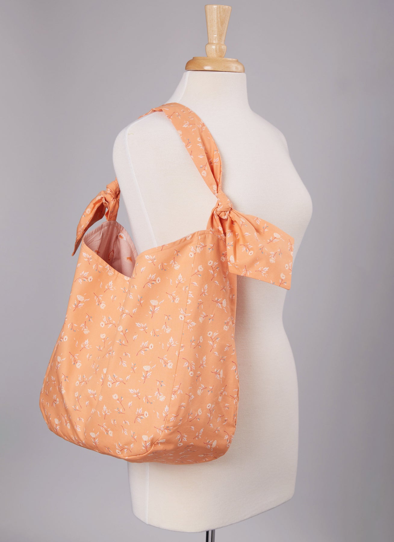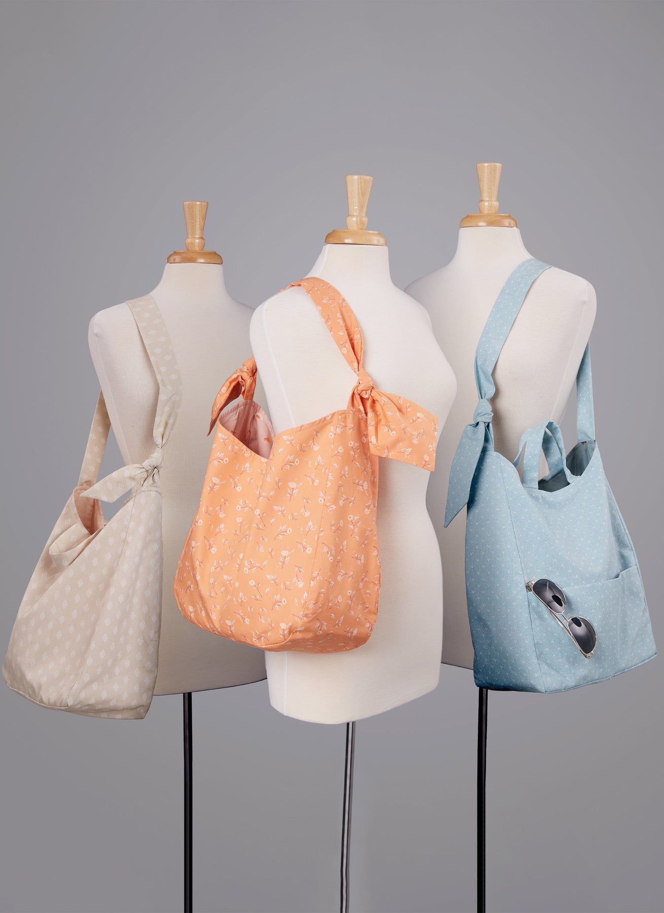 Die Soft-Easy-Bag-Varianten A und B haben einen verstellbaren Schultergurt und Griffe. Ansicht B hat außerdem eine Außentasche vorne. Ansicht C hat einen geknoteten Henkel. Ansicht D hat Falten und kontrastierende Griffe und Bänder.