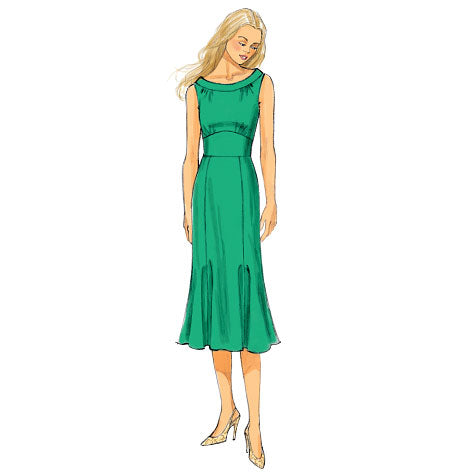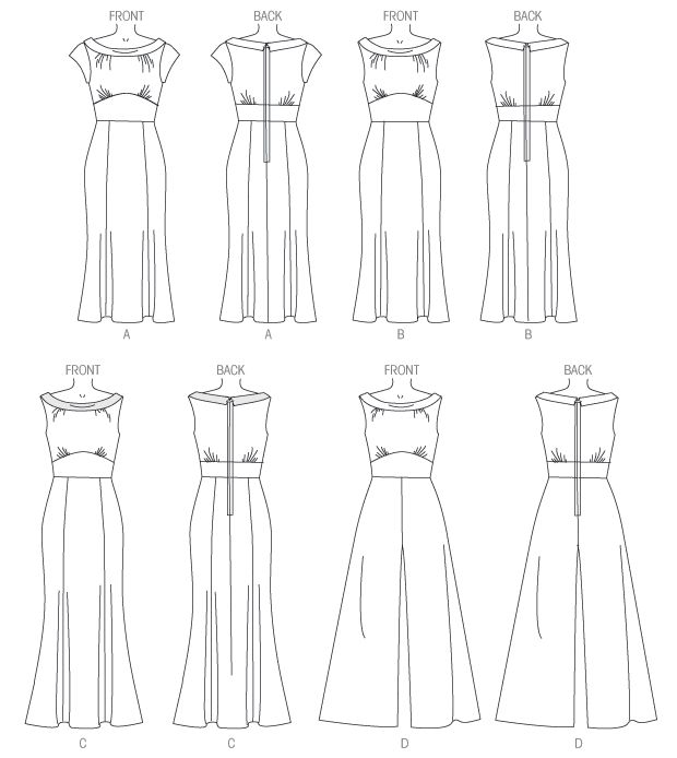 Kleid und Overall (im Brustbereich locker sitzend) haben einen Schrägkragen, ein gefüttertes Oberteil und eine gefütterte Taille sowie einen Reißverschluss am Rücken. A: selbstgefütterte Ärmel. A, B und C: Prinzessinnennähte. D: weites Bein. Alle sind im Hüftbereich halb tailliert.