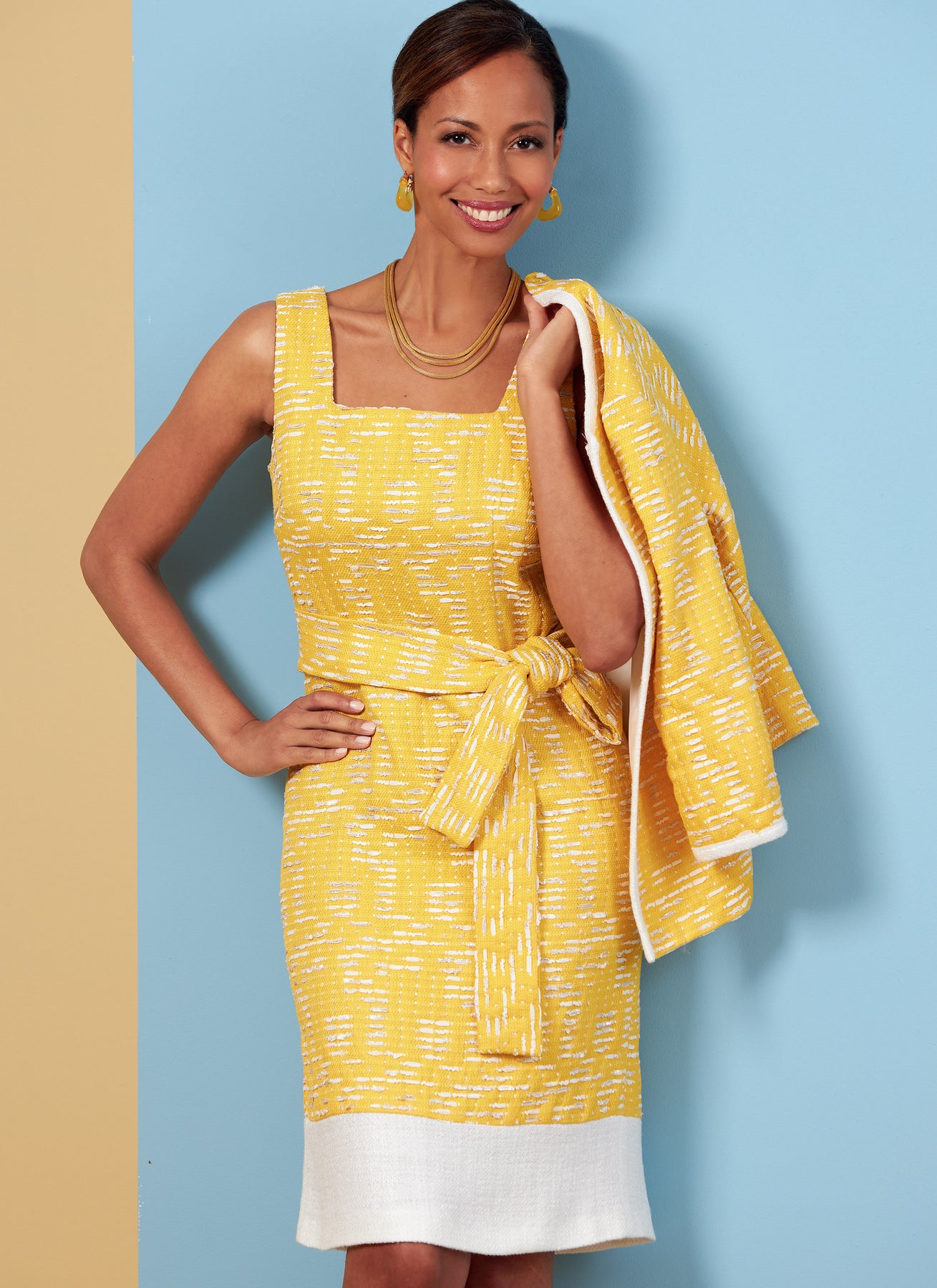 Gefütterte, vorne offene kurze Jacke mit kontrastierender Borte. Ärmelloses Oberteil mit quadratischem Halsausschnitt und Kleid mit Rückenreißverschluss und Schärpe. Die Hose mit weitem Bein hat einen seitlichen Reißverschluss.