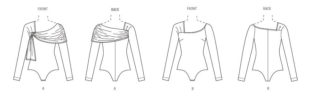 Der eng anliegende Body hat einen asymmetrischen Ausschnitt, der mit einem 1/4"-Gummizug stabilisiert wird, Brustabnäher, lange Ärmel und wird mit Druckknöpfen geschlossen. Ansicht A hat vorne und hinten geraffte Drapierungen, die durch eine Schleife gezogen werden.