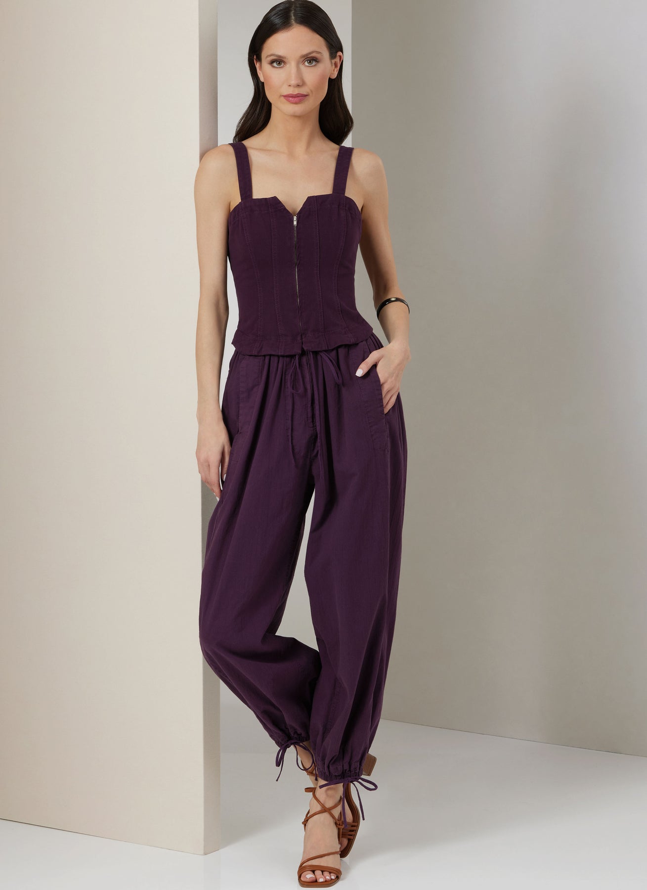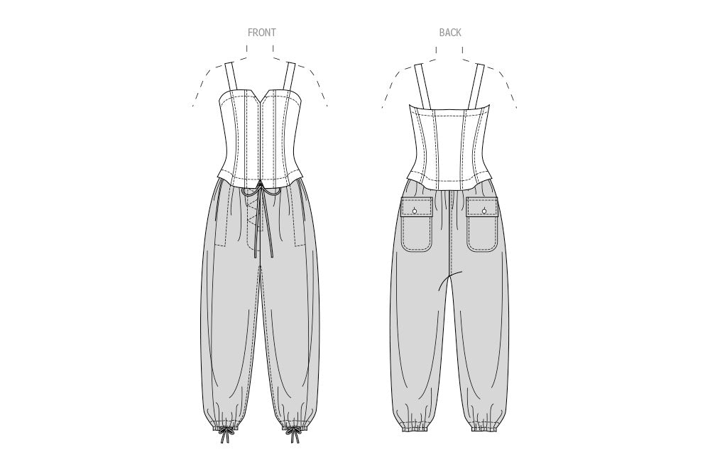 Der Overall mit Reißverschluss hat ein eng anliegendes Oberteil mit Prinzessnähten und ist an einem locker sitzenden Unterteil mit Mock-Fly-Nähten und Kordelzügen vorne und am Knöchel befestigt. Der Overall hat seitliche Taschen an der Vorderseite und aufgesetzte Taschen mit Klappen auf der Rückseite.