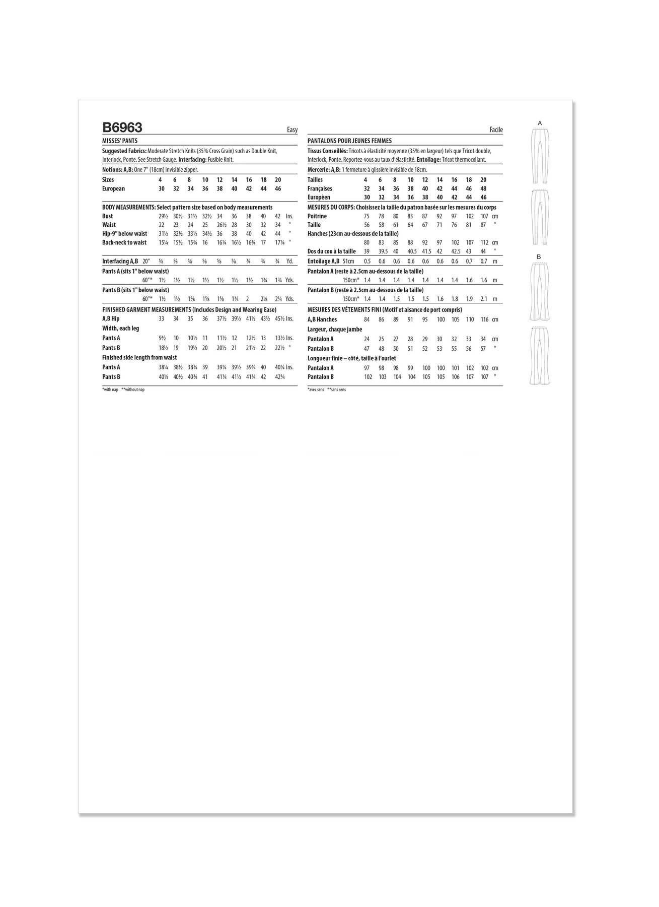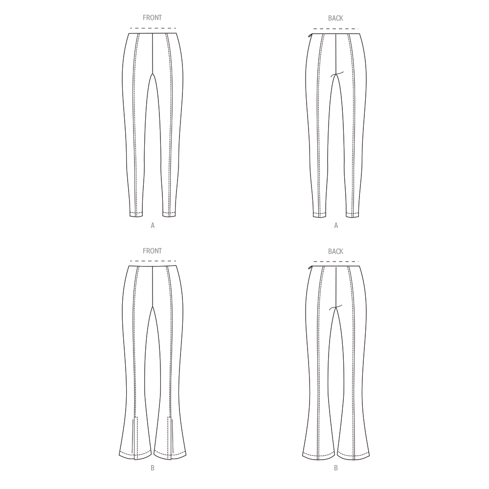 Die eng anliegenden Hosen sitzen 1" unterhalb der Taille, haben Prinzessnähte, Steppnähte, Taillenbesätze und abgesteppte Säume. Ansicht A ist tailliert geschnitten. Ansicht B ist Bootcut mit Schlitz vorne. Beide Hosen haben einen unsichtbaren Seitennaht-Reißverschluss.
