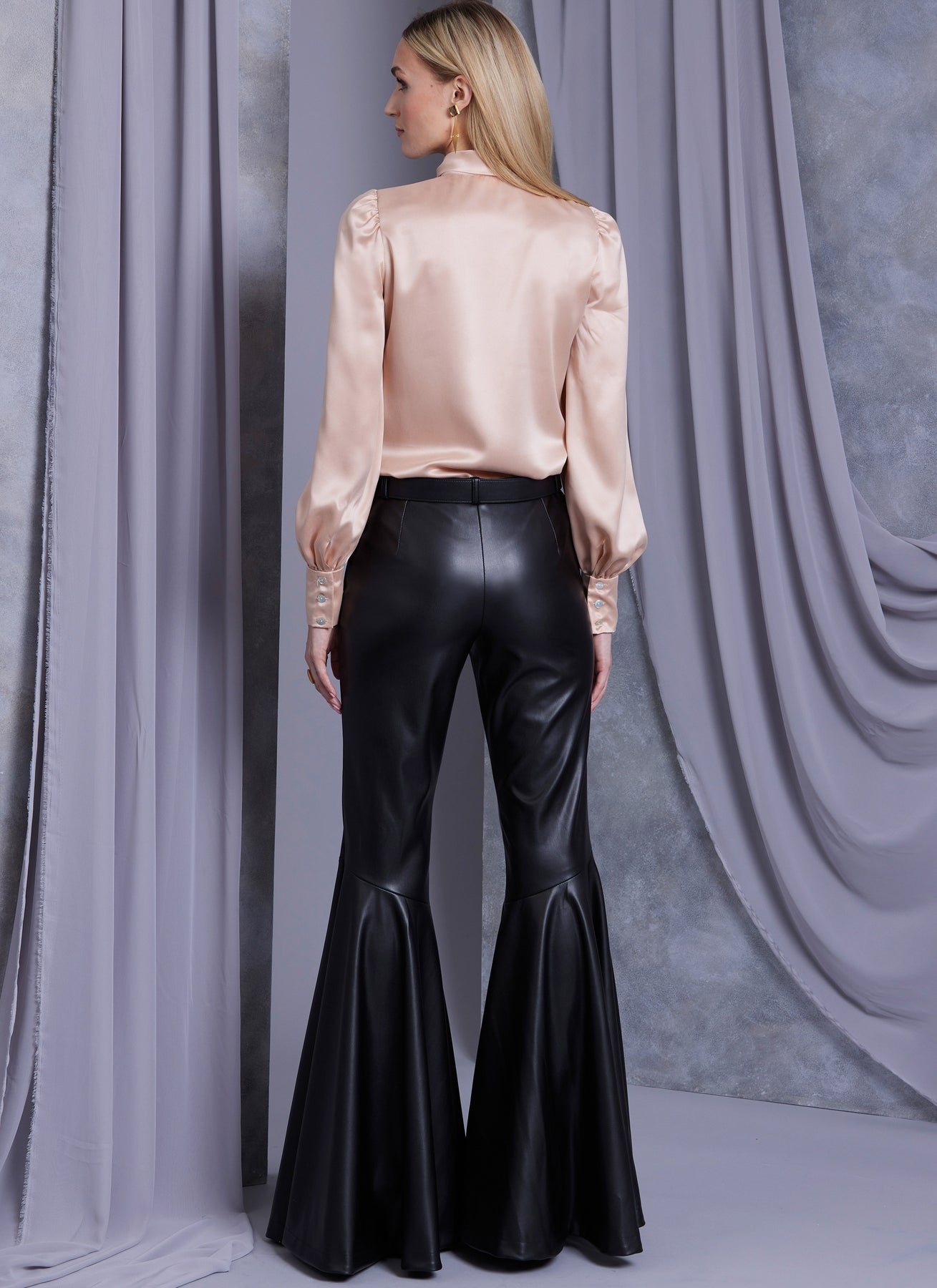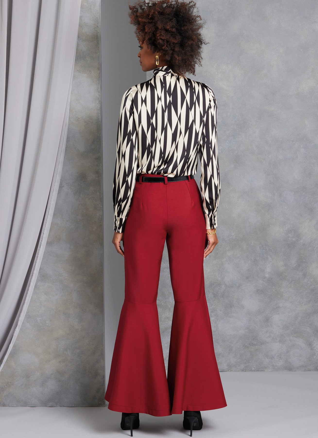 Die Hose mit Glockenboden sitzt 1" unterhalb der Taille. Die Hose hat einen Reißverschluss vorne, Seitentaschen vorne, Abnäher hinten, schräge Saumabschlüsse und genähte Säume.