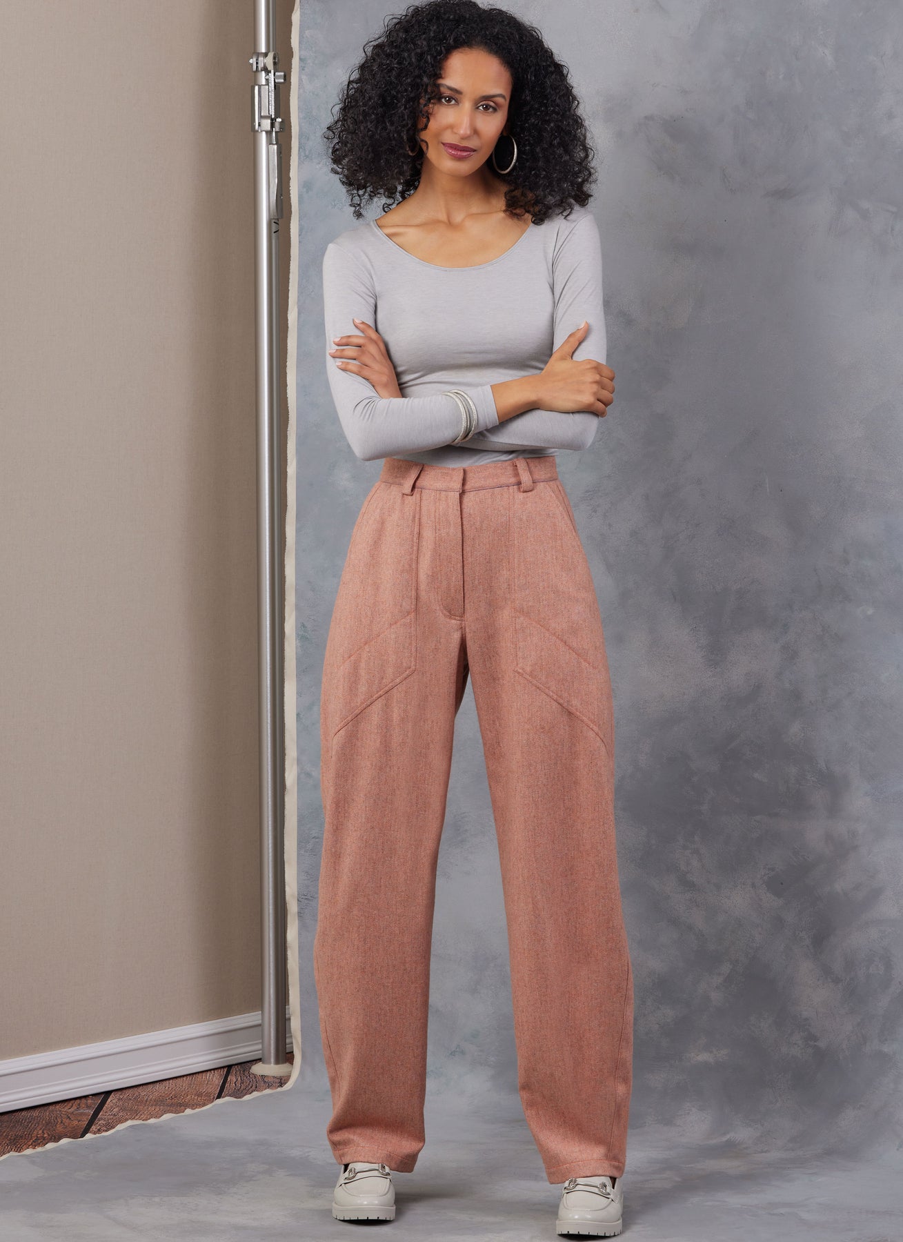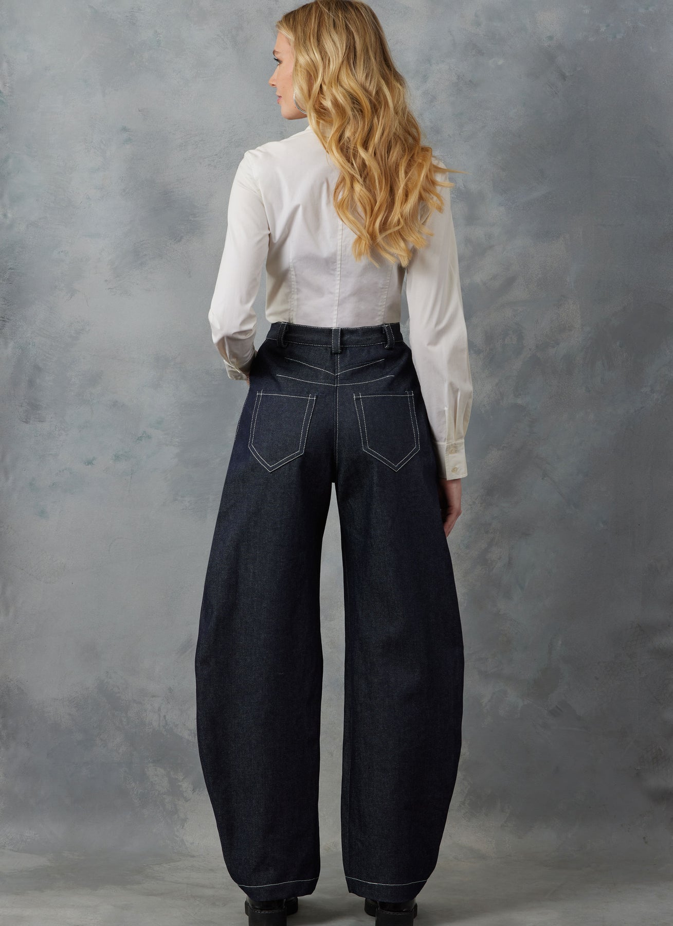 Die Hose mit hoch geschnittenem Bein hat Gürtelschlaufen, Abnäher am Rücken, einen Reißverschluss am Hosenschlitz, einen Haken- und Riegelverschluss an der Taille und einen abgesteppten Saum. Ansicht A hat Vordertaschen im Jeans-Stil und aufgesetzte Gesäßtaschen. Ansicht B hat seitliche Nähte vorne, aufgesetzte Taschen vorne und hinten.