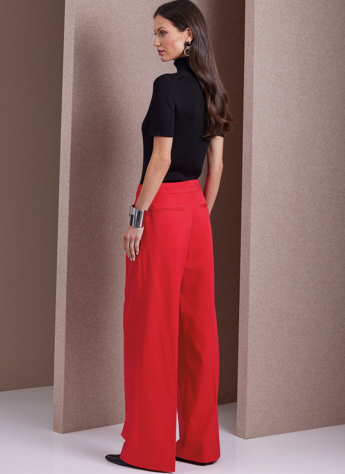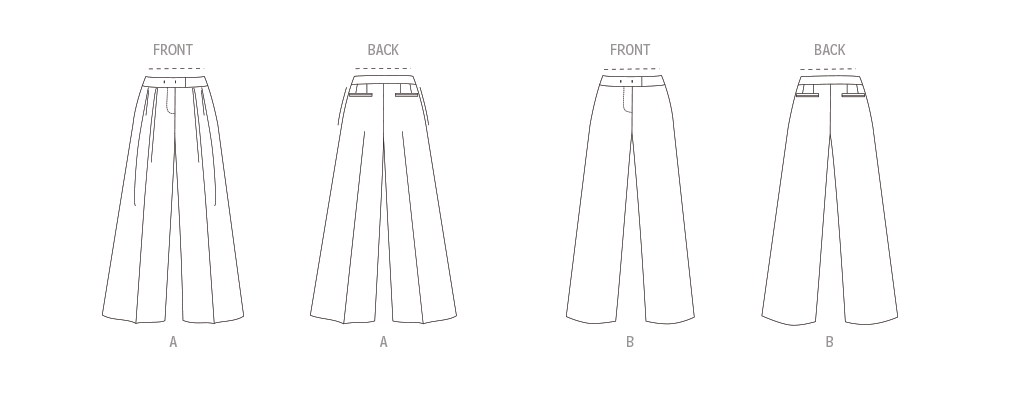 Niedrig angesetzte Hose mit weitem Bein, Formbund mit Haken- und Riegelverschluss, Hosenschlitz-Reißverschluss und unsichtbare Säume. Ansicht A hat eine plissierte Vorderseite, Seitennahttaschen und ist an der Hüfte locker geschnitten. Ansicht B hat eine flache Vorderseite und ist an der Hüfte tailliert.