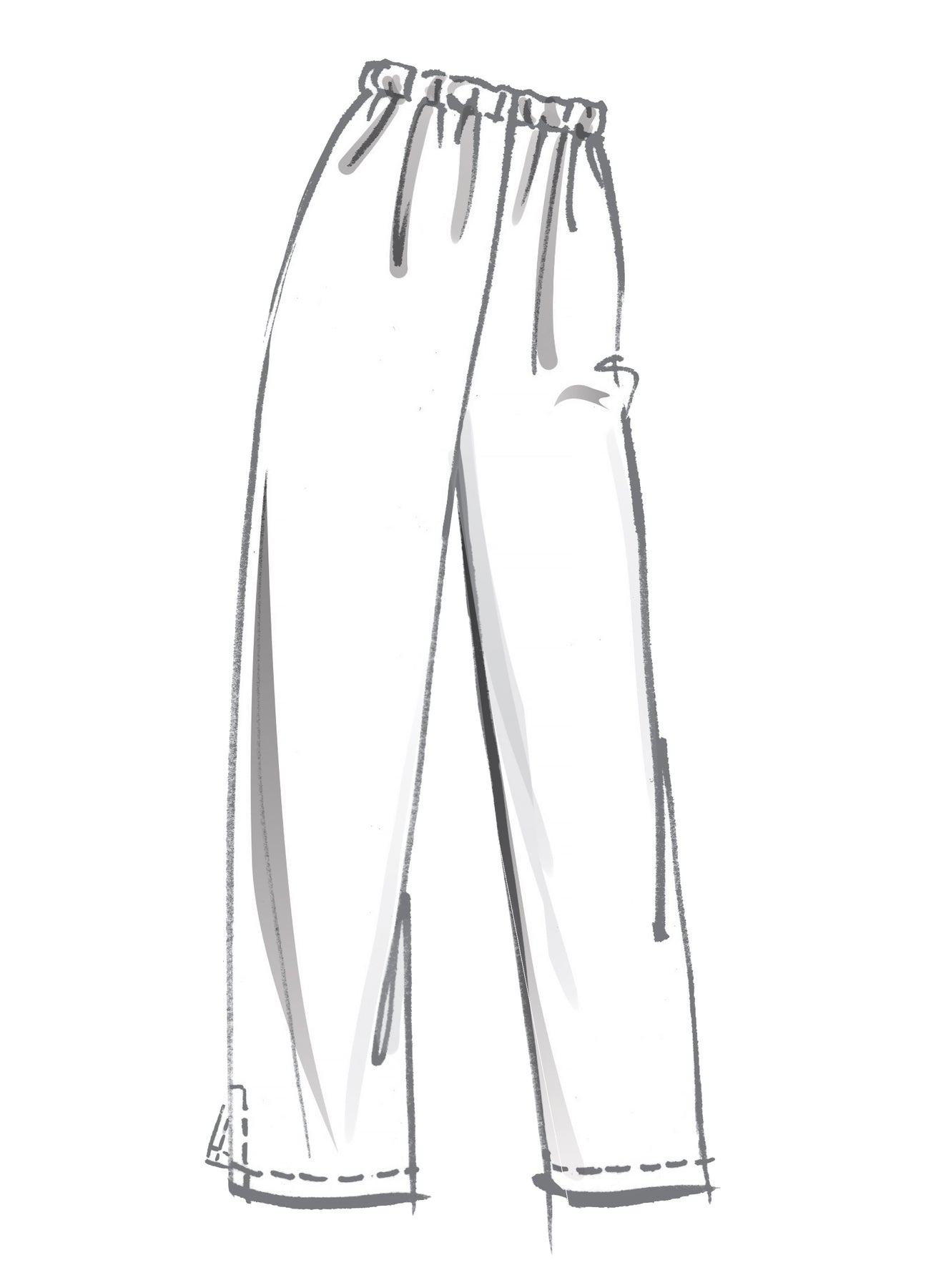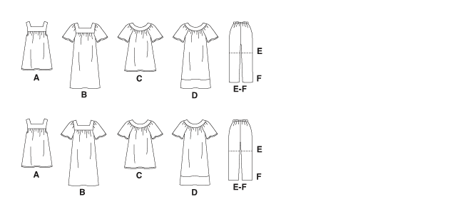 Locker sitzendes Pullover-Oberteil oder Kleid über der Mitte des Knies mit Passe und Raffungen. A, b: quadratischer Ausschnitt. A: ärmellos. B, c, d: kurze Raglanärmel. C, d: runder Halsausschnitt. D: Kontrastpasse & Saumband. Kurze Hosen mit geradem Bein oder Hosen, die über den Knöchel gehen, haben einen elastischen Bund.