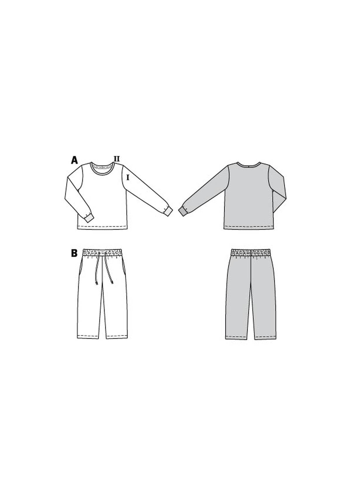 Stoffempfehlung:A I, B: Sweatshirtstoffe, Fleece, Jersey, A II: Bündchenware. B: Auch Baumwollstoffe AB: Zwillingsnadel. B: Gummiband, 7 mm breit: 1,15 m - 1,30 m, 1,20 m Kordel