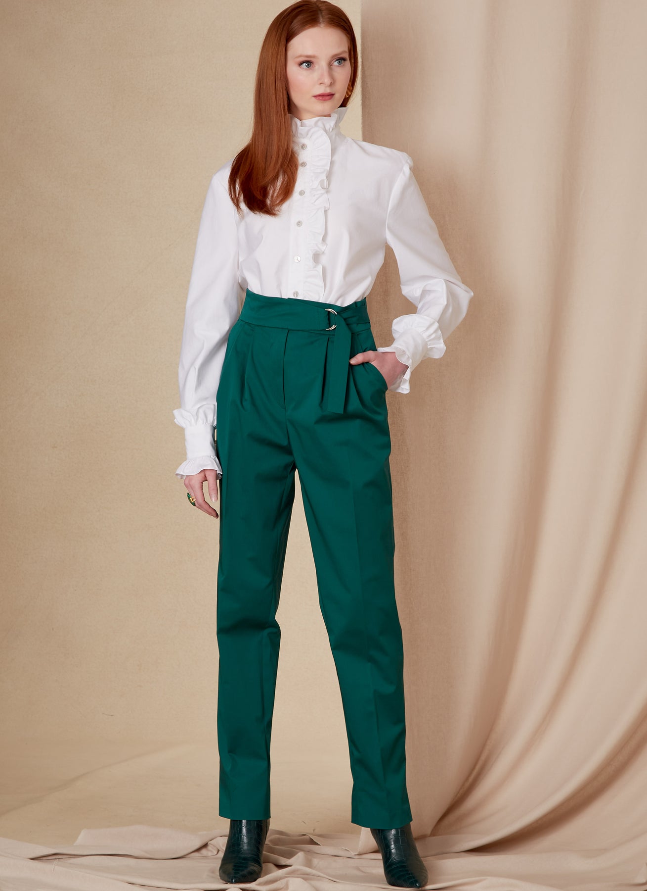 Leicht konisch zulaufende Hose für zierliche Damen und Mädchen mit hoher Taille, Plissee vorne, seitlichen Taschen vorne und Schlitz vorne.