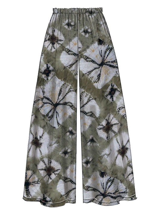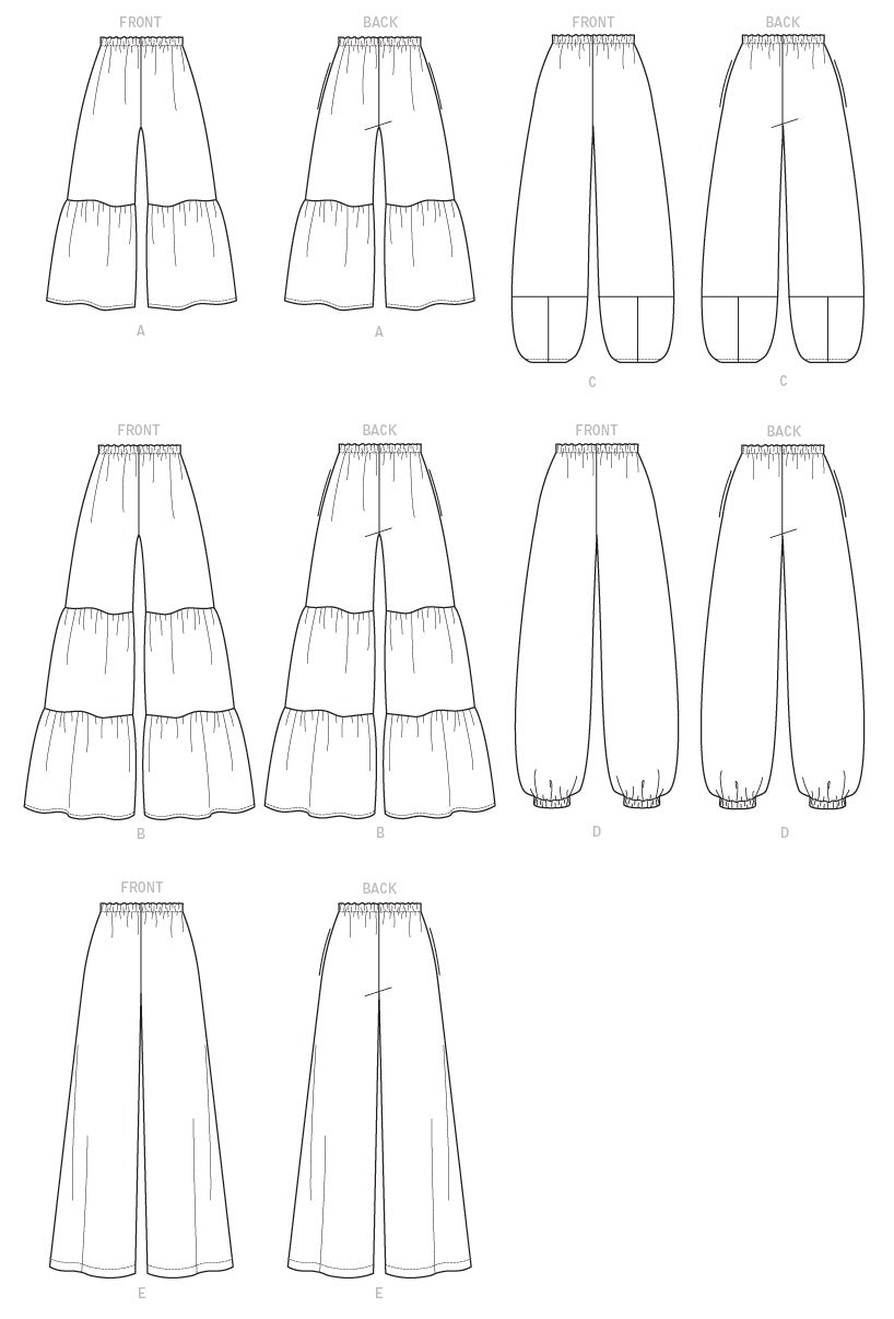 Sehr locker sitzende Hosen zum Überziehen mit elastischer Taille und Bein- und Längenvariationen.