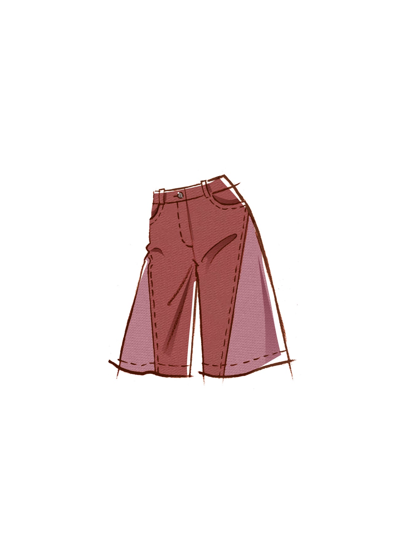 Patchwork-Shorts und -Hosen mit Konturbund verfügen über einen Reißverschluss vorne, Abnäher hinten, einen abgesteppten Saum und Taschen. Die Hosen der Ansichten A und B haben Kontrasteinsätze.