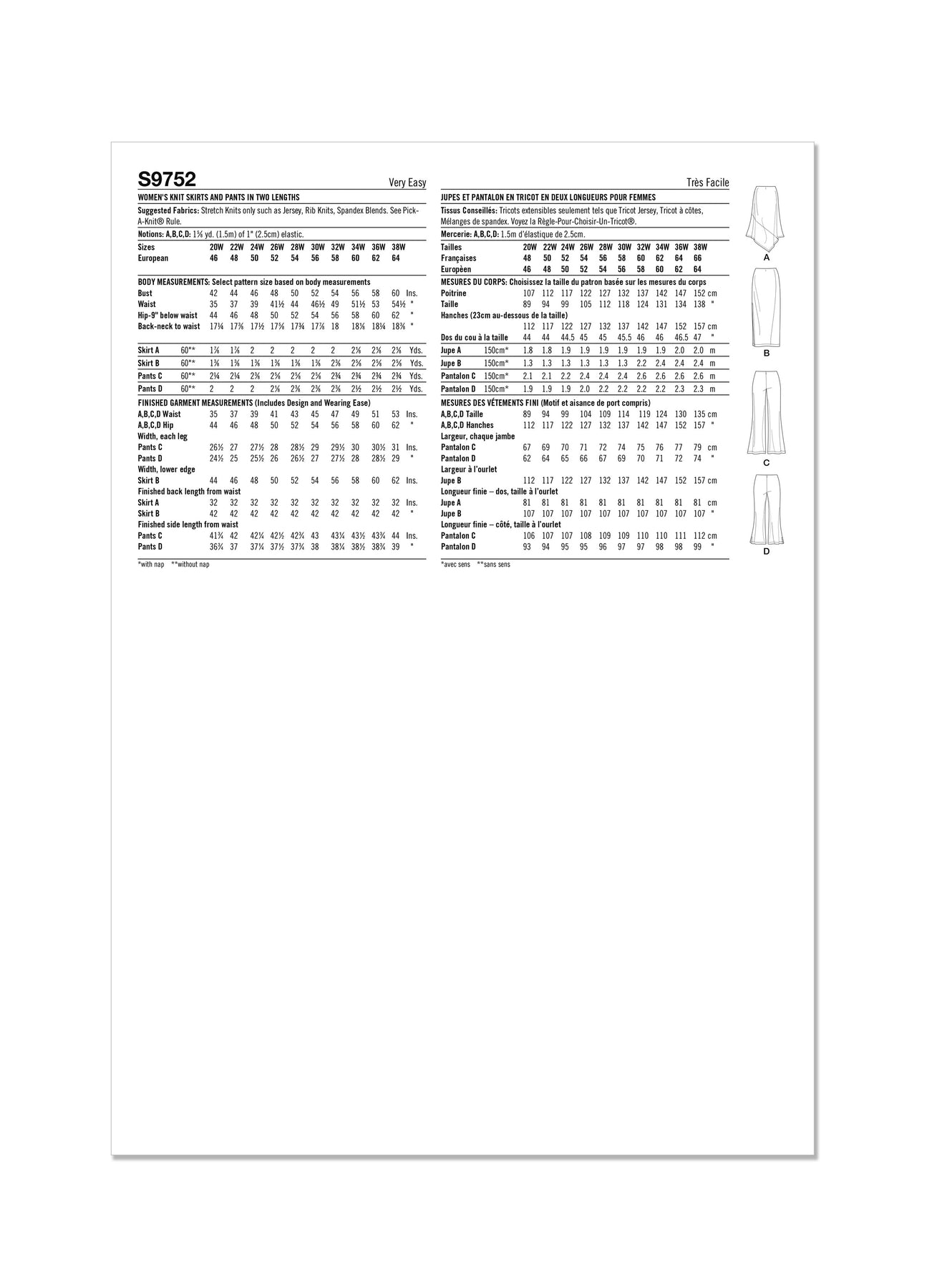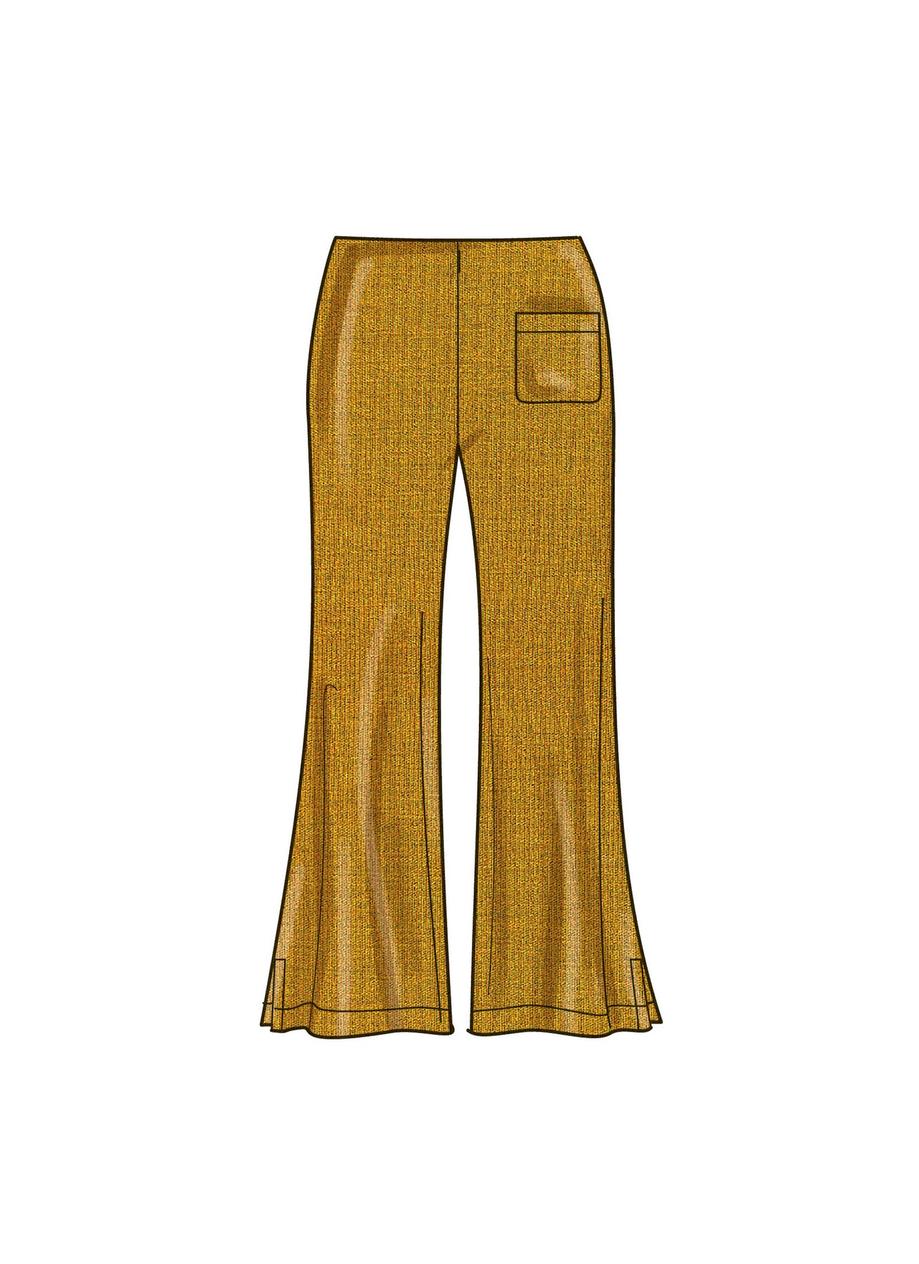 Diese einfach zu nähenden Strickröcke und -hosen sind ein Muss für Ihren Kleiderschrank. Ansicht A ist ein asymmetrischer Midirock. Ansicht B ist ein langer Rock mit einem Seitenschlitz. Die Ansichten C und D sind Schlaghosen mit aufgesetzten Gesäßtaschen. Die Hosen sind in zwei Längen erhältlich. Nur 1 Stunde Nähmaschinenzeit.