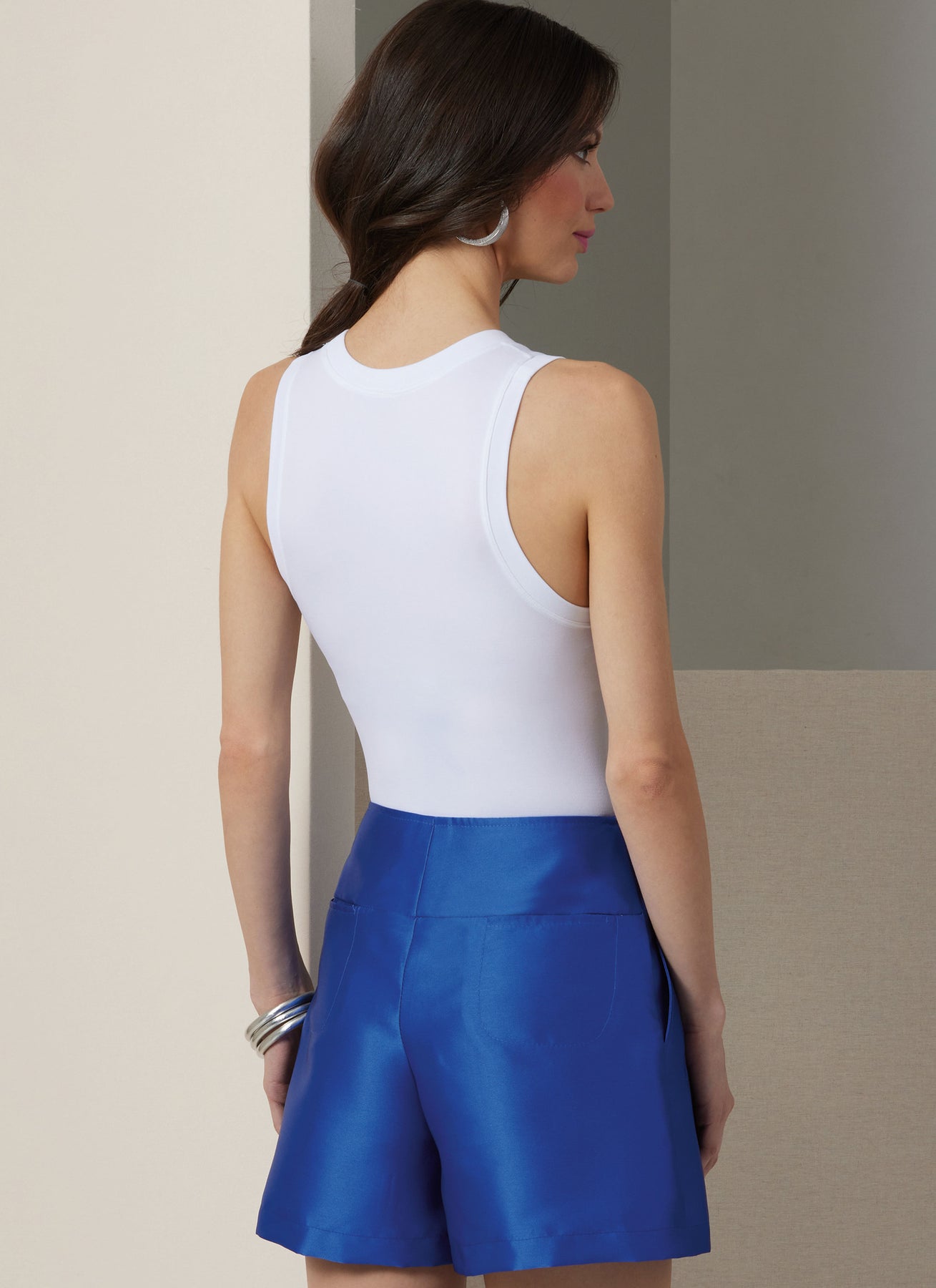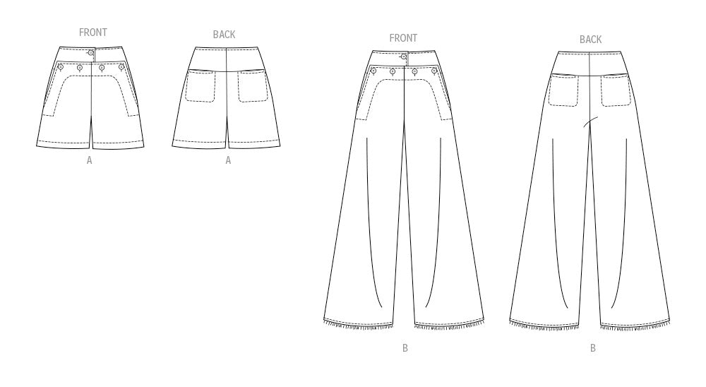 Shorts oder Hosen im Matrosenstil, die an der Hüfte anliegen, auf der natürlichen Taille sitzen, eine Frontklappe mit Knopfverschluss, seitliche Vordertaschen und eine Rückenpasse mit Nahttaschen haben. Ansicht A hat einen abgesteppten Saum. Ansicht B hat Saumabschlüsse mit eingenähtem Fransendetail.