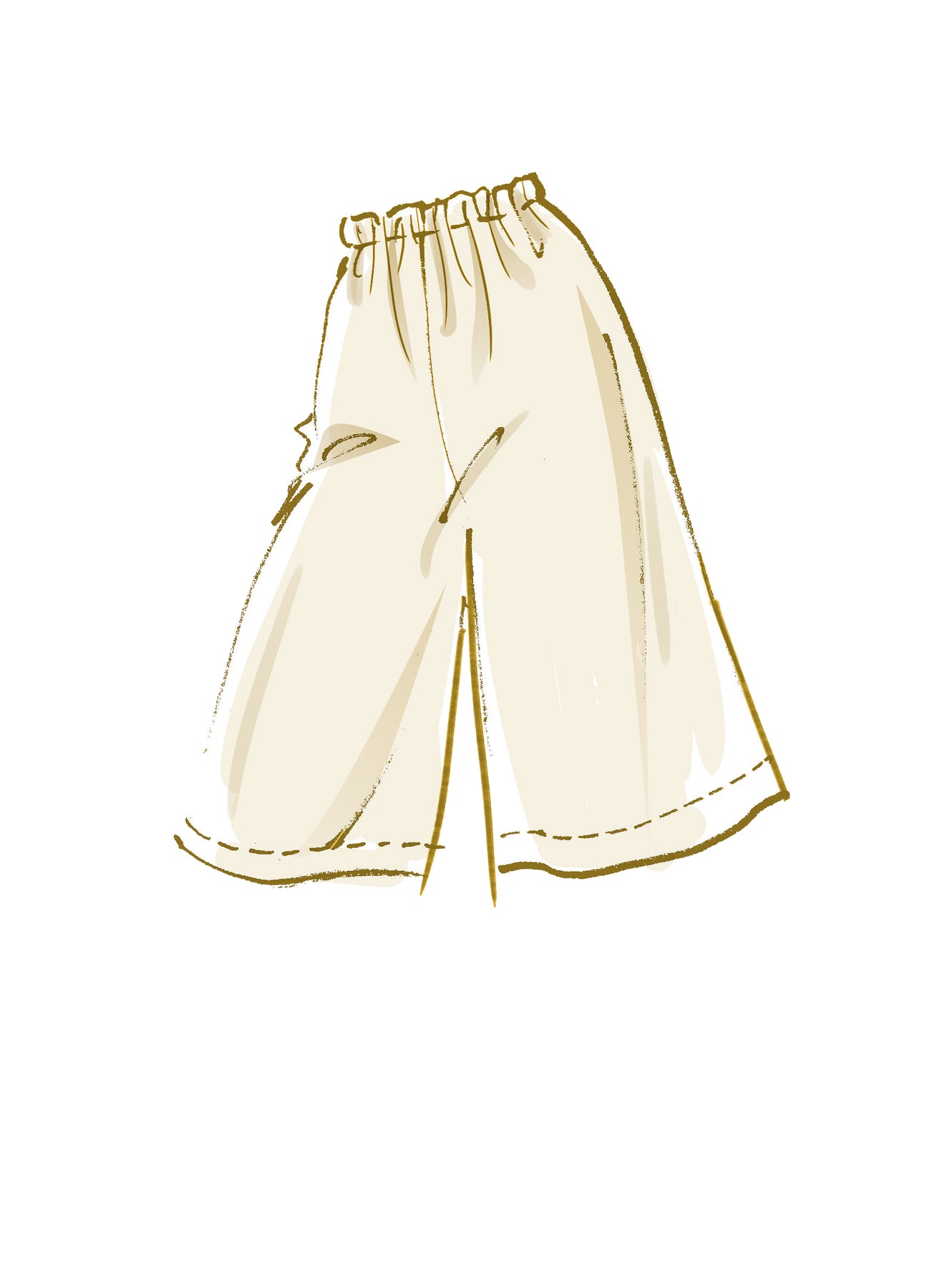 Shorts mit elastischer Taille für Mädchen, die das Nähen lernen. A: geraffter Saum. B: breiter Saum. C: Oberschenkel.
