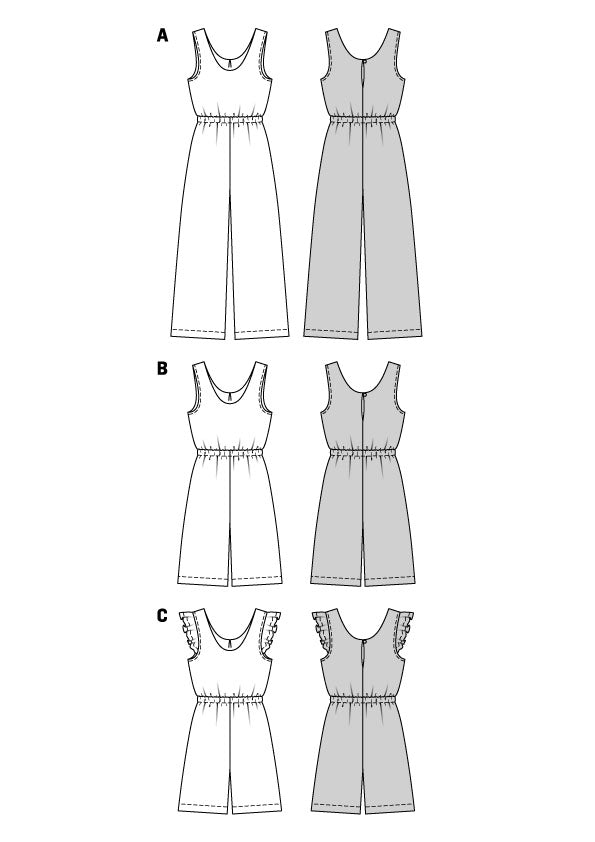 Unkomplizierter Einteiler in drei verschiedenen Längen und so easy zu nähen. Die Overalls haben im Rücken einen Schlitz zum bequemen An- und Ausziehen und werden mit einem Gummizug in der Taille in Form gebracht. Variante C hat an den Armausschnitten zusätzlich verspielte Rüschen.