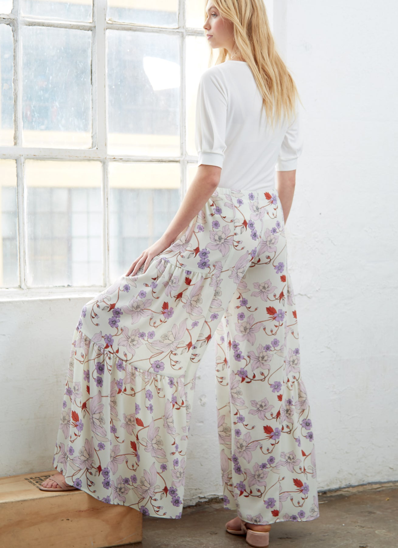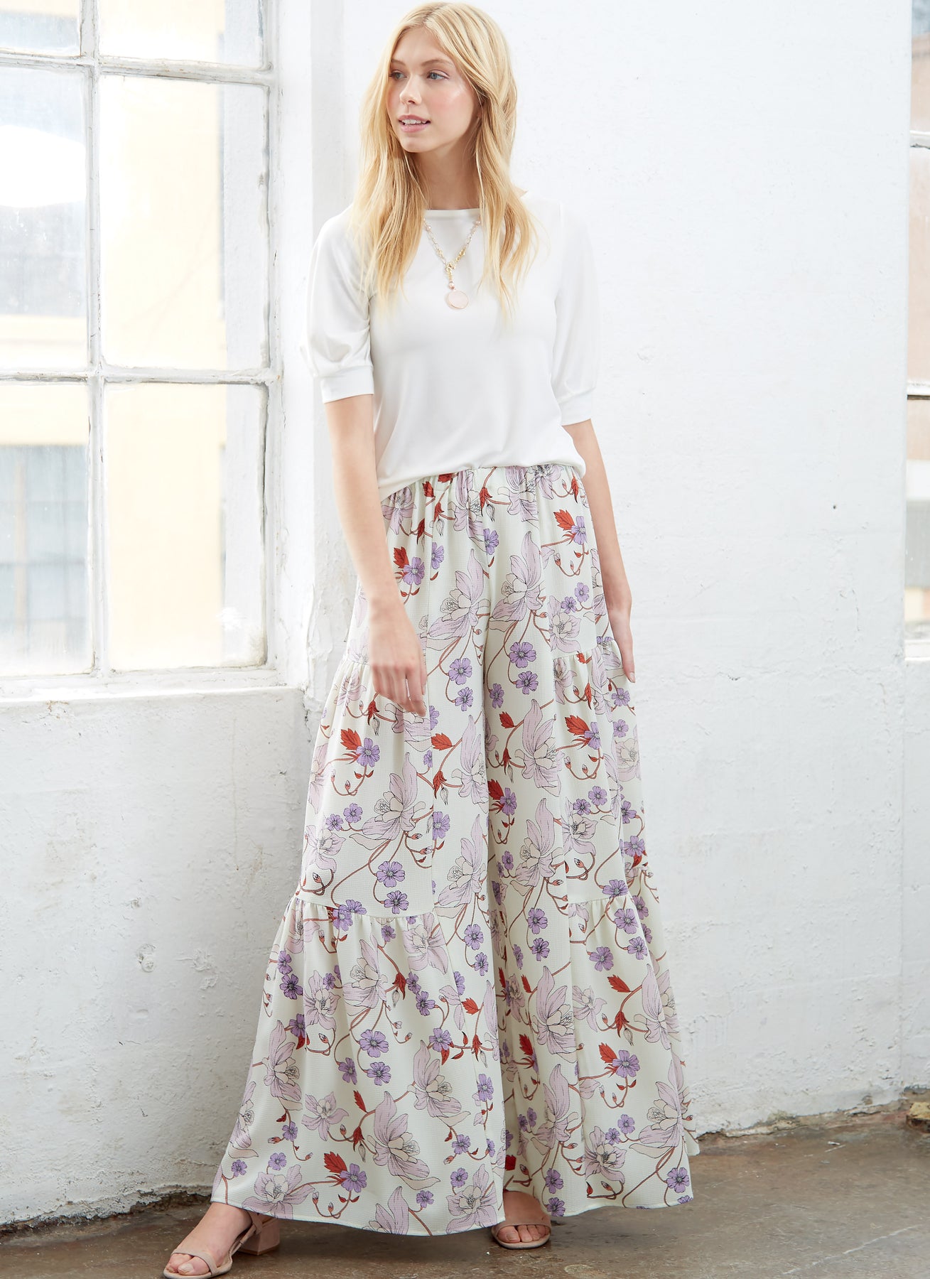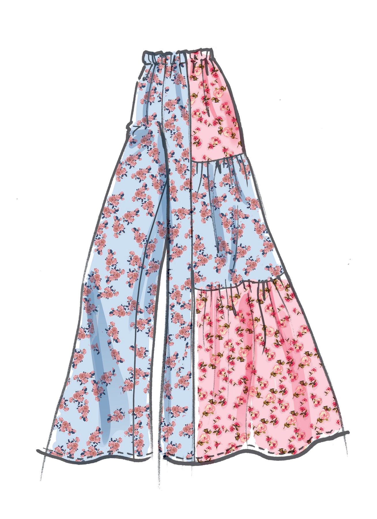 Hosen mit elastischer Taille und langem Bein für Damen. A: Gekürzt mit Rüschensaum. B:,C: volle Länge. C: Kontrast.