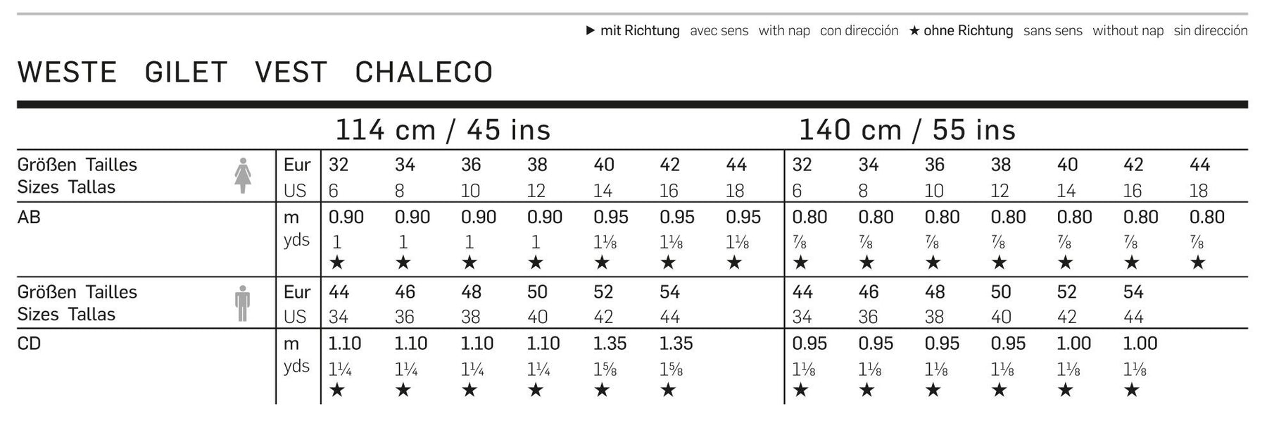 Diese Weste (AB für Damen, CD für Herren) komplettiert sowohl Shirts als auch Hemden und Blusen auf modische Art. Unterschiedliche Stoffe und Details ergeben immer wieder einen neuen Look.
