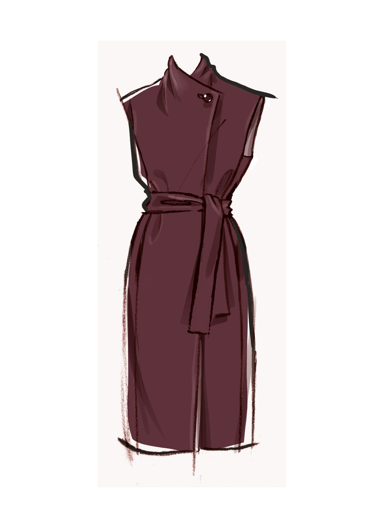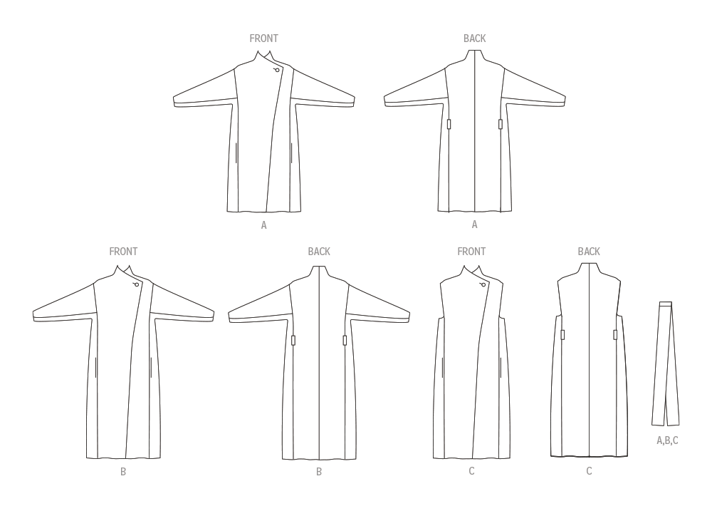 Mantel und Weste mit hohem Kragen haben überschnittene Schultern, Seitenteile, Taschen und Gürtel.