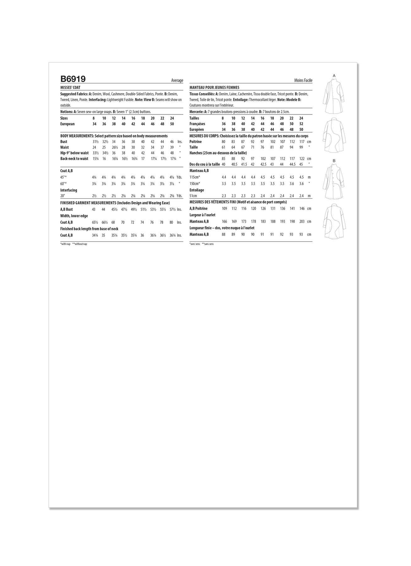 Stoffempfehlung:A: Denim, Wolle, Kaschmir, doppelseitige Stoffe, Ponte. B: Denim, Tweed, Leinen, Ponte. Einlage: Leichtes Fixiermaterial. Hinweis: Ansicht B: Die Nähte sind auf der Außenseite sichtbar.
