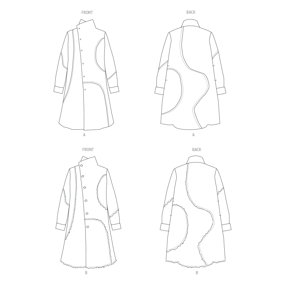 Asymmetrischer Mantel mit Seitennahttaschen. Ansicht A hat Steppnähte an den Nähten und einen verdeckten Druckknopfverschluss. Ansicht B hat Außennähte und Knöpfe auf der Vorderseite.