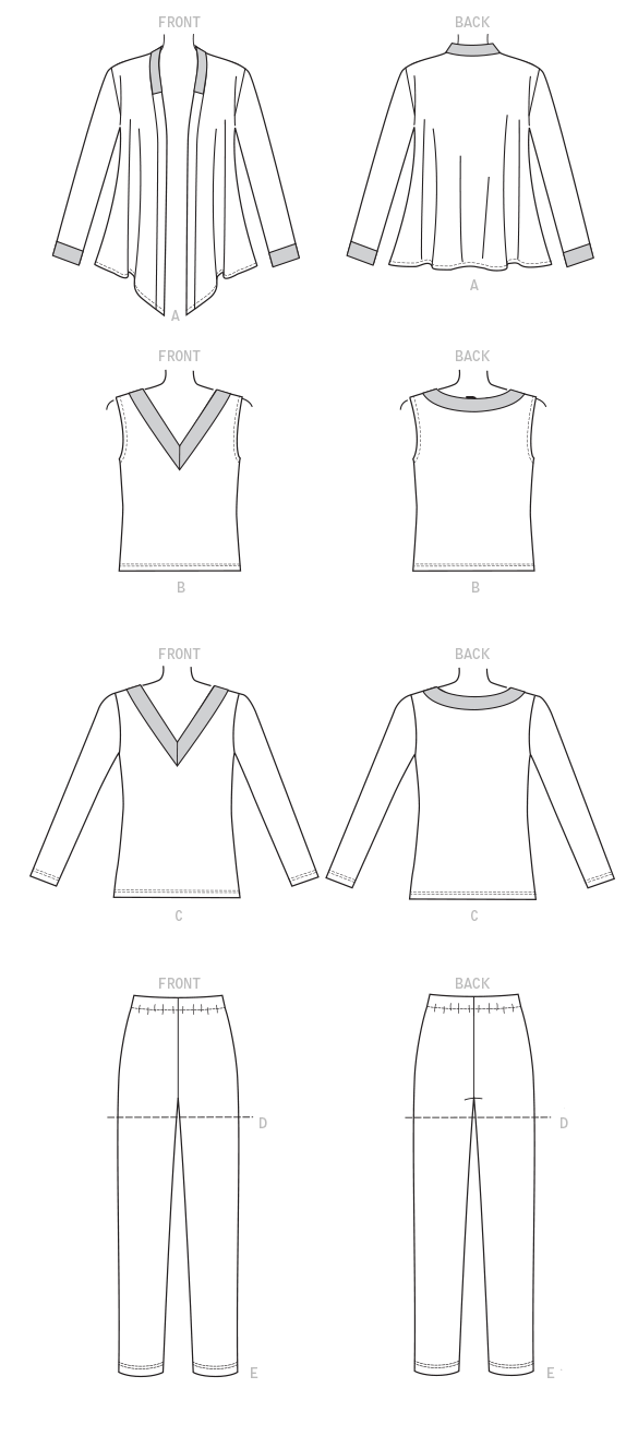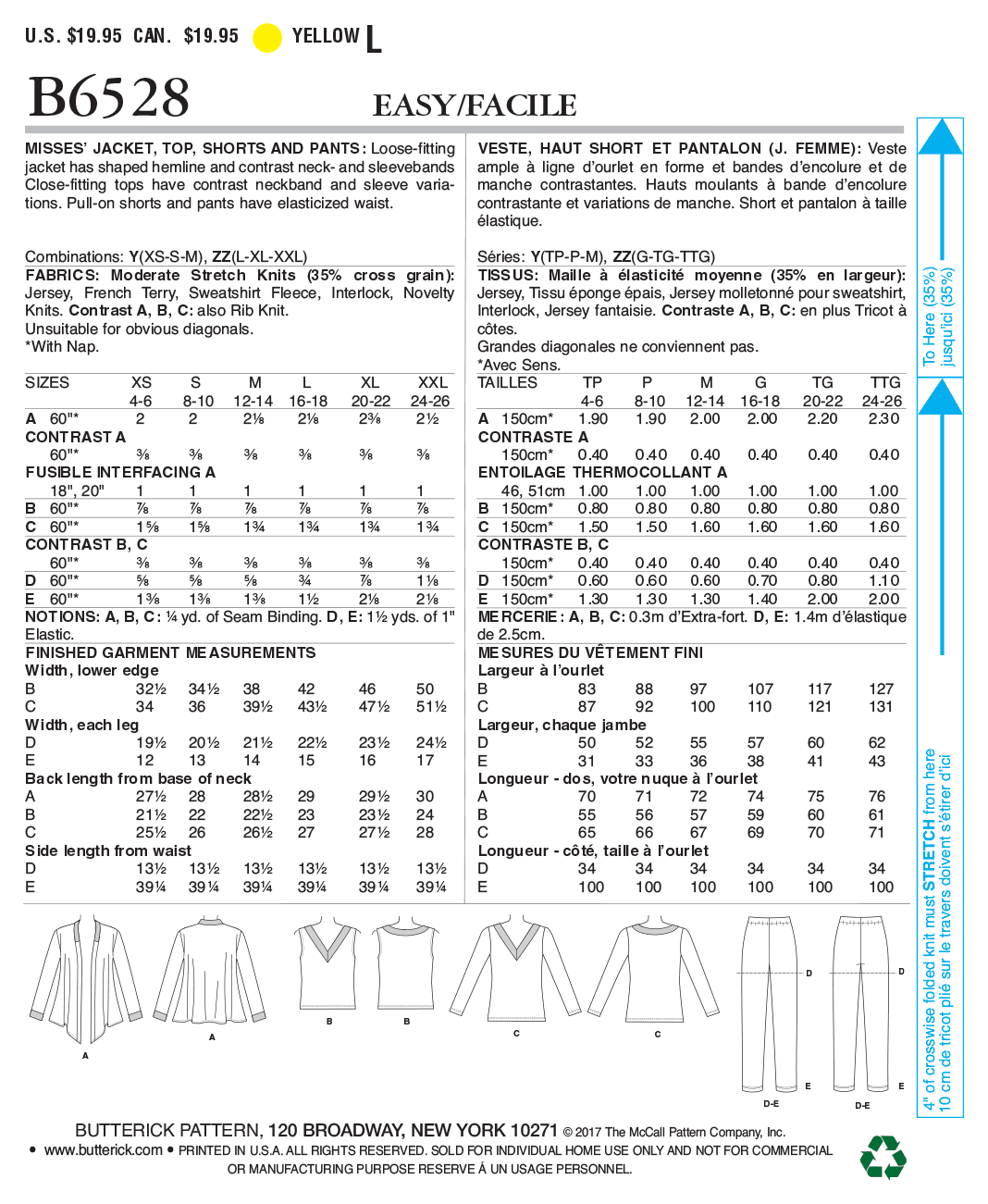 Dieses vielseitige Butterick Schnittmuster B6528 bietet Ihnen die Möglichkeit, eine stilvolle Jacke, ein bequemes Top und eine Hose zu nähen. Die Hose ist in zwei Längenvarianten erhältlich, sodass Sie sie je nach Anlass oder Jahreszeit anpassen können. Jacke und Top sind locker geschnitten, was für einen angenehmen Tragekomfort und eine moderne Silhouette sorgt. Ideal für alle, die individuelle und modische Kleidungsstücke selbst gestalten möchten. Mit diesem Schnittmuster kreieren Sie mühelos vielseitige Outfits, die sich perfekt kombinieren lassen.