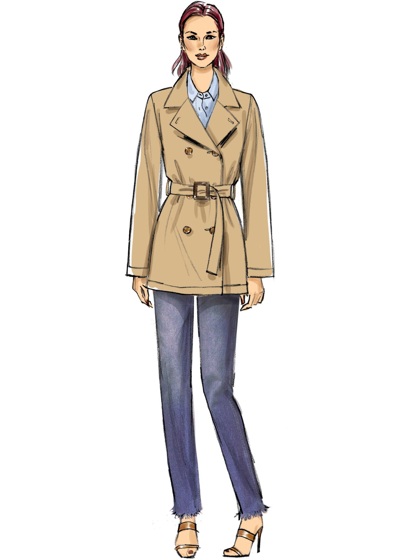 Für die kalten Frühlingstage eine Jacke oder ein Mantel mit doppelter Knopfleiste und einem Gürtel. Ein kleiner Kragen macht die Jacke/Mantel stilvoll und noch wärmer.