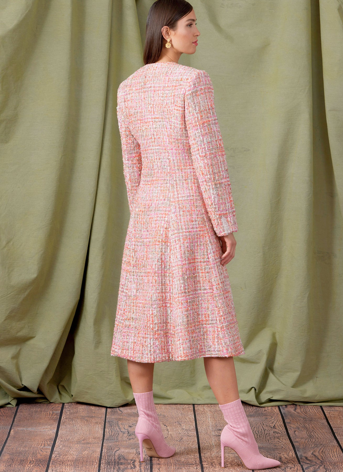 Halbgefütterter Mantel mit langen, zweiteiligen Ärmeln mit , Schulterpolstern, seitlichen Vordertaschen und seitlichen Rücken- und Vorderseitennähten. Der Mantel ist in verschiedenen Längen erhältlich. Ansicht A ist ein kragenloser Mantel. Ansicht B hat einen Stehkragen und aufgesetzte Taschen.