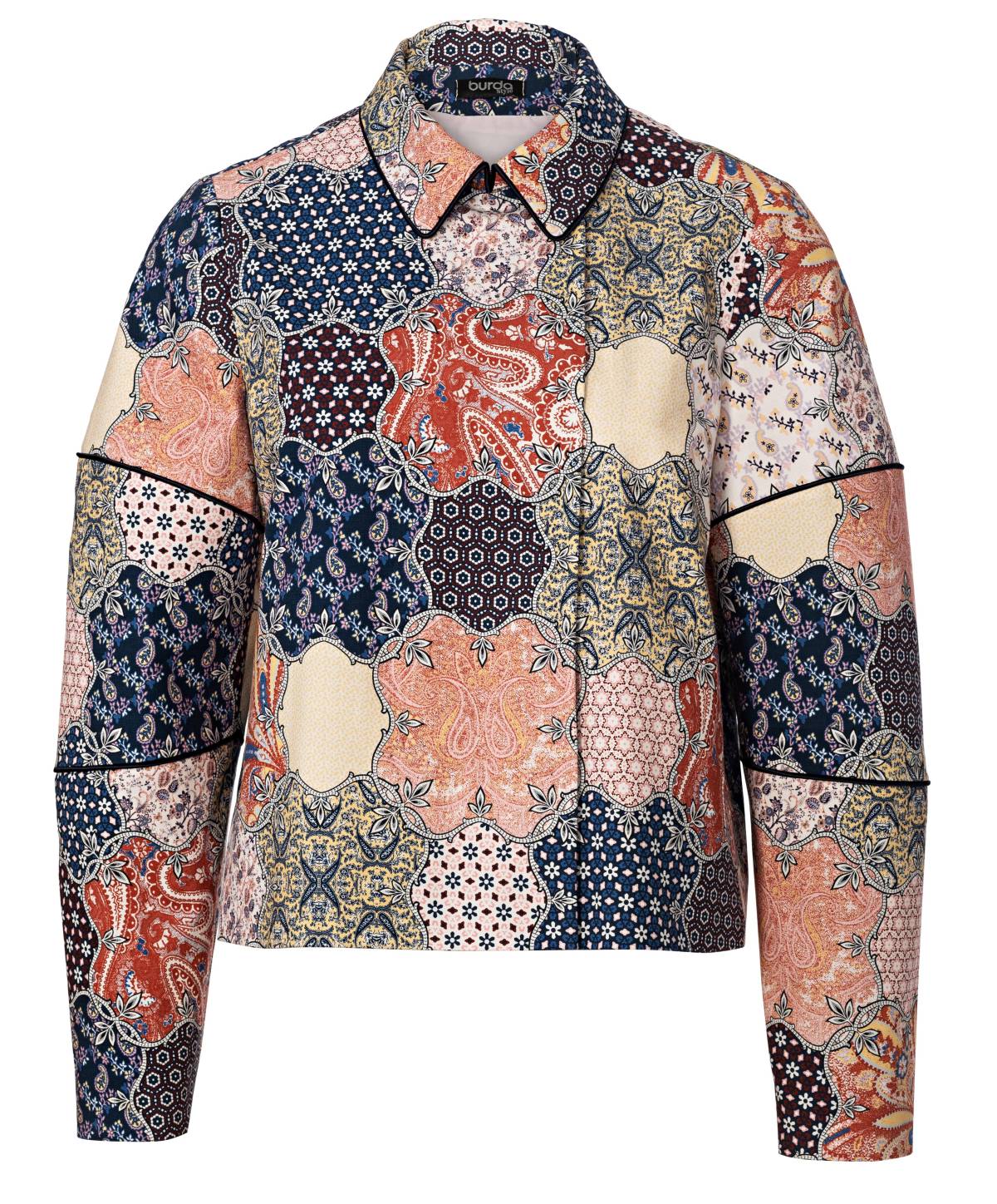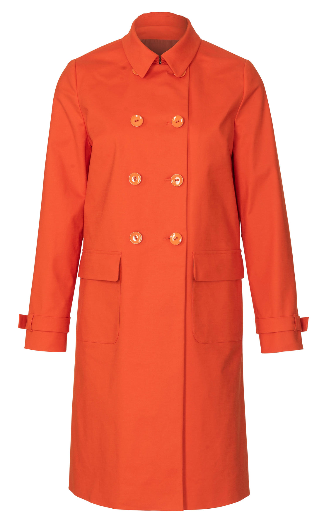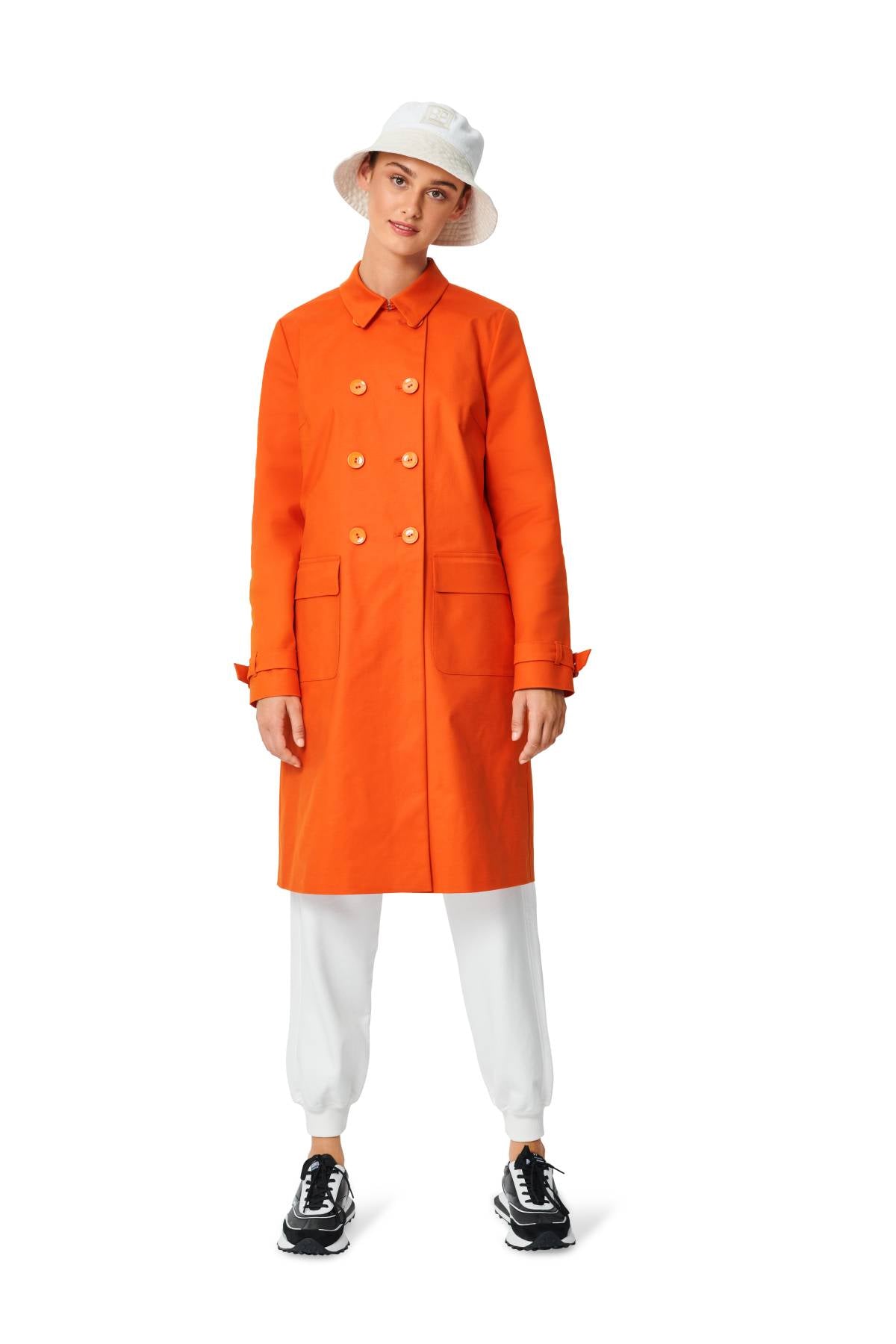 Der doppelreihig geknöpfte Mantel mit aufgesetzten Taschen erinnert an einen Trench, ist genauso angesagt, benötigt aber nicht so viele Details um schick auszusehen. Die kurze Jacke mit Paspeln an den unterteilten Ärmeln und seitl. Eingifftaschen wirkt durch den gemusterten Stoff gar nicht klassisch.