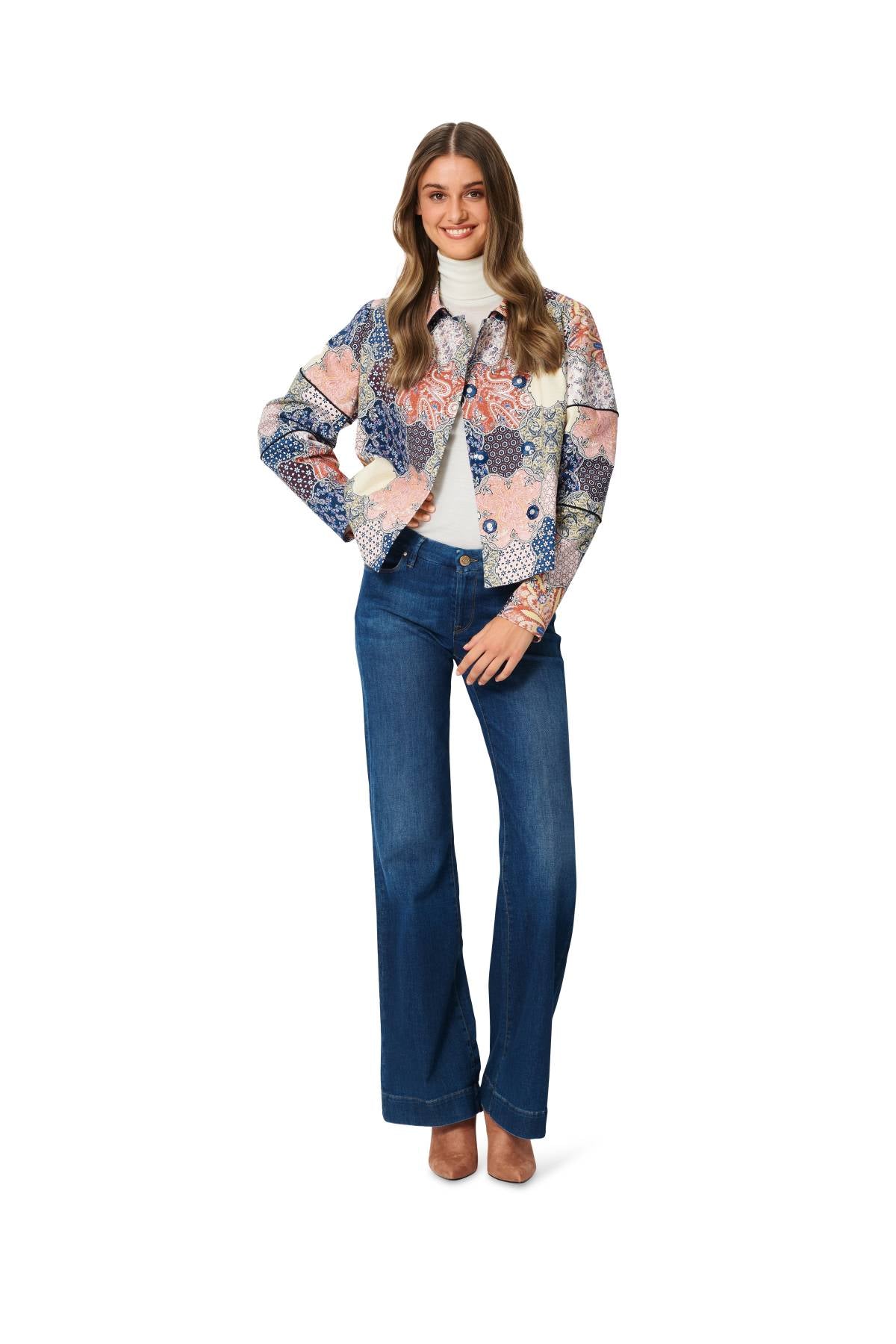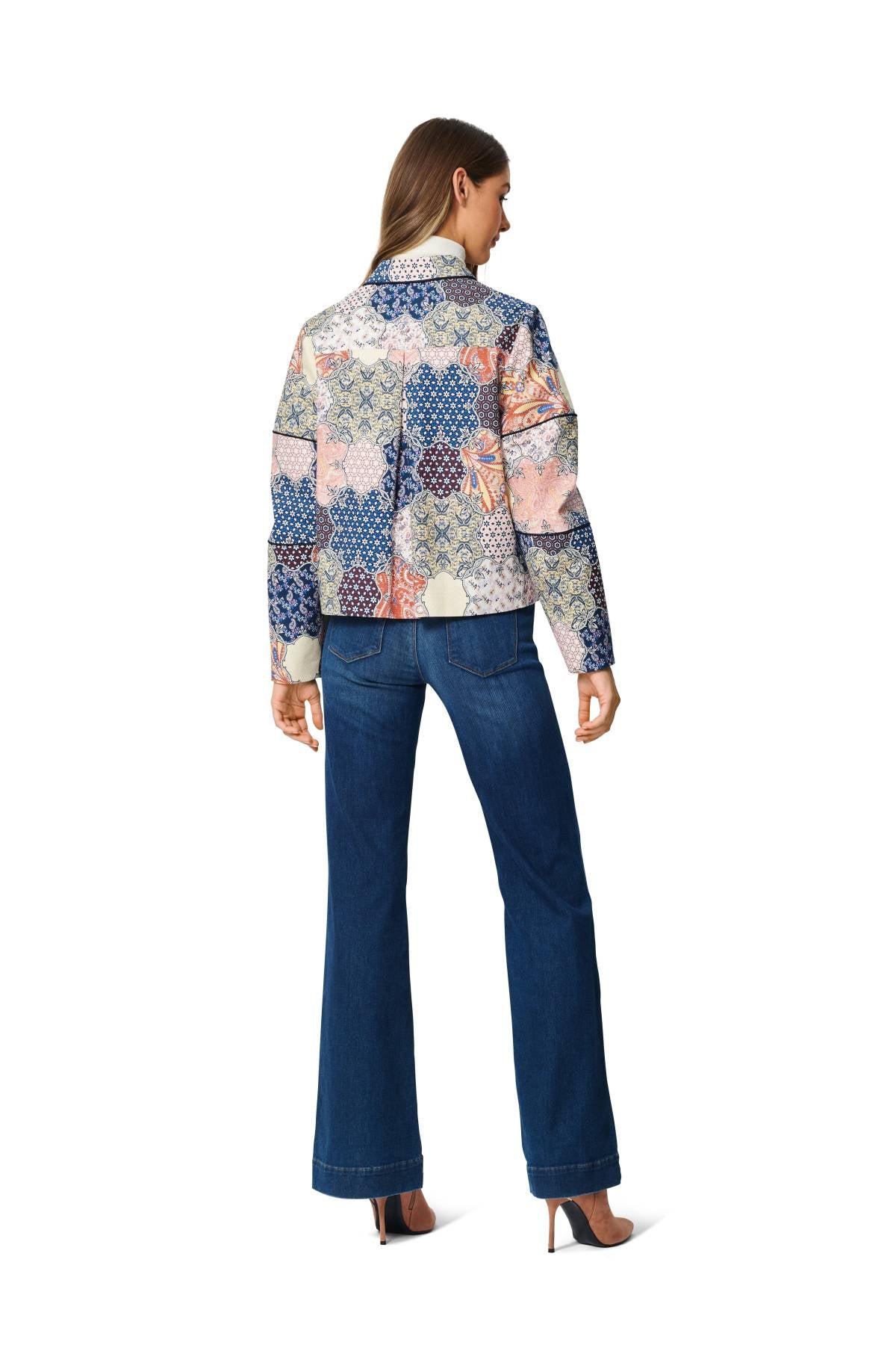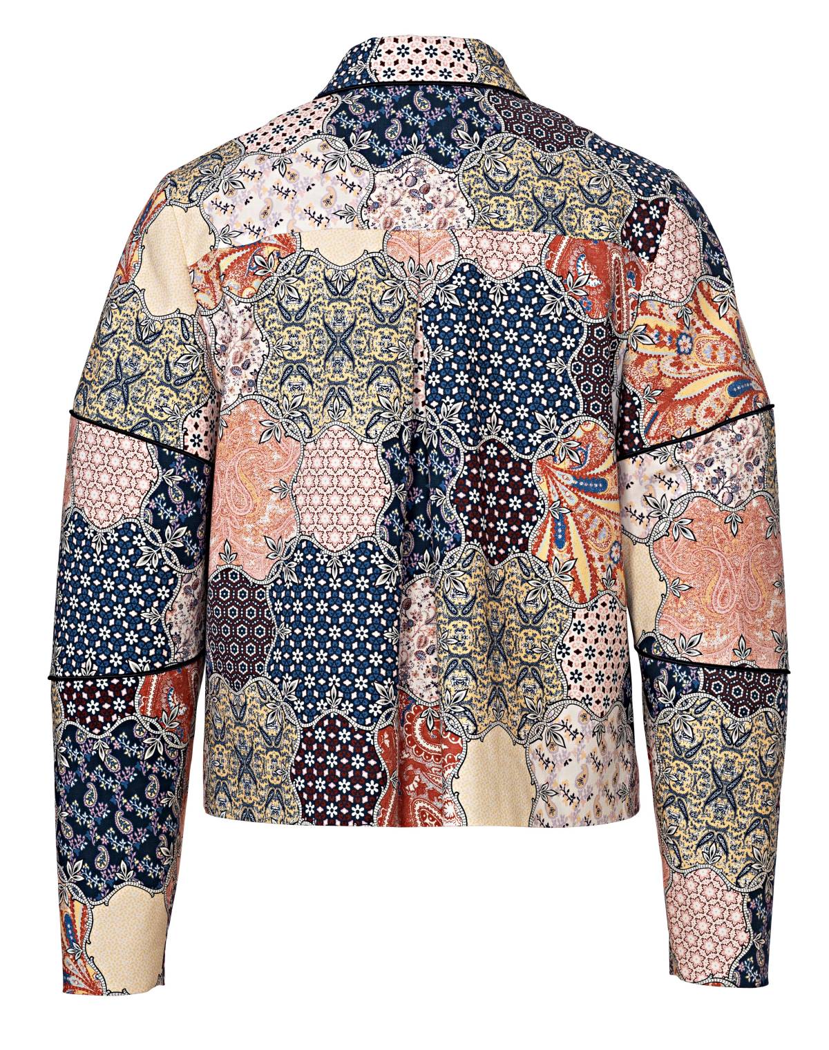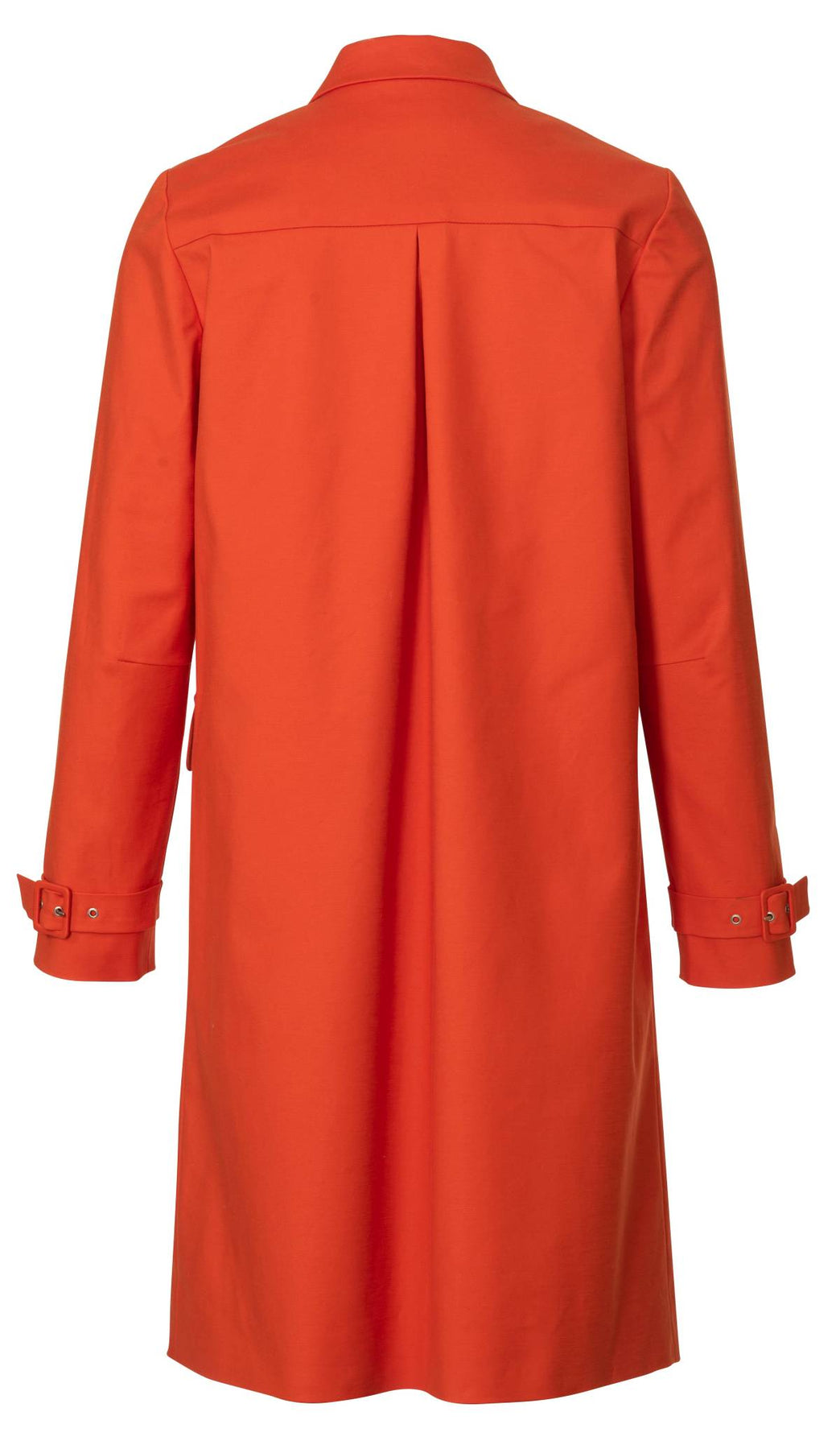Der doppelreihig geknöpfte Mantel mit aufgesetzten Taschen erinnert an einen Trench, ist genauso angesagt, benötigt aber nicht so viele Details um schick auszusehen. Die kurze Jacke mit Paspeln an den unterteilten Ärmeln und seitl. Eingifftaschen wirkt durch den gemusterten Stoff gar nicht klassisch.