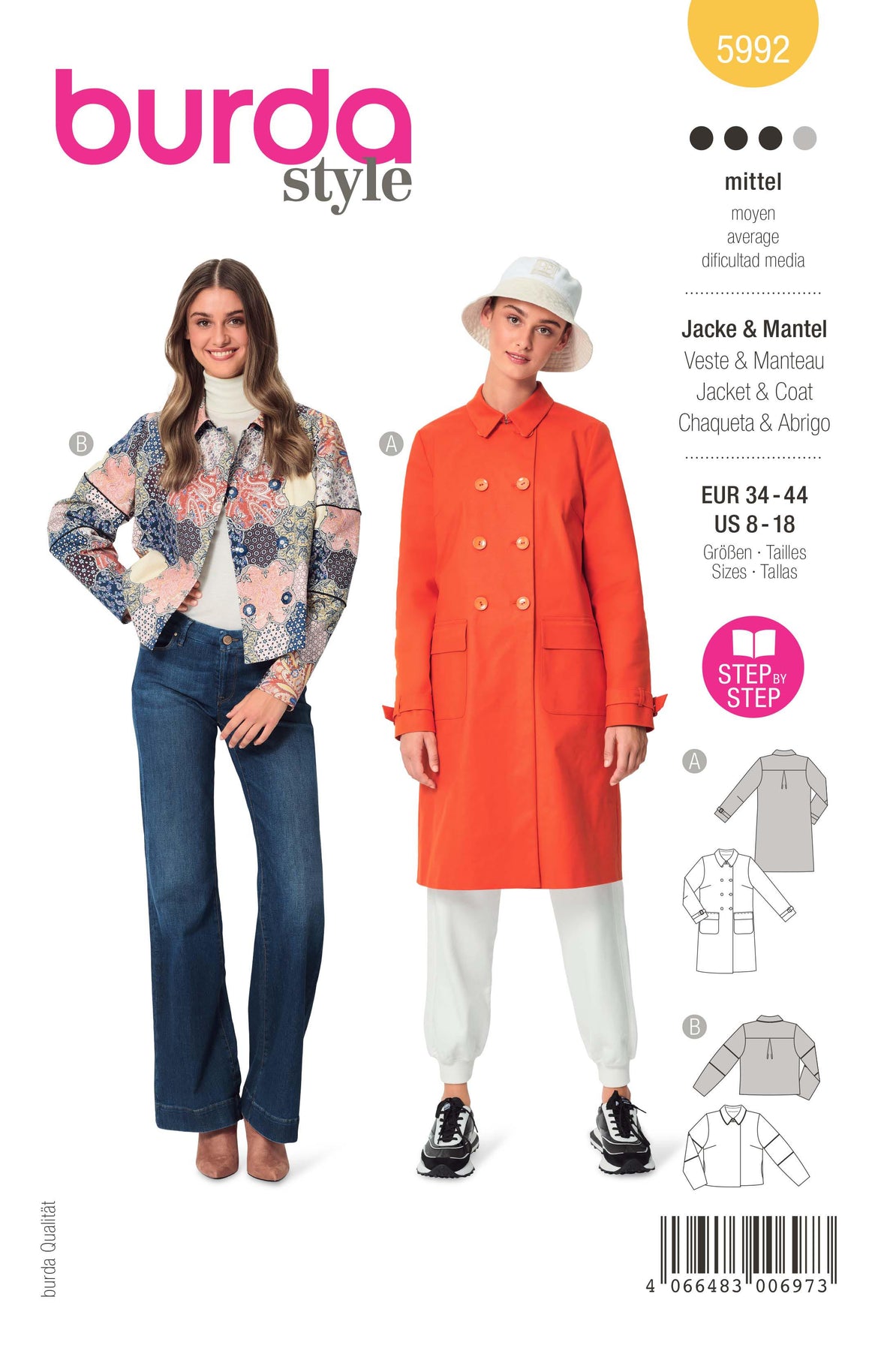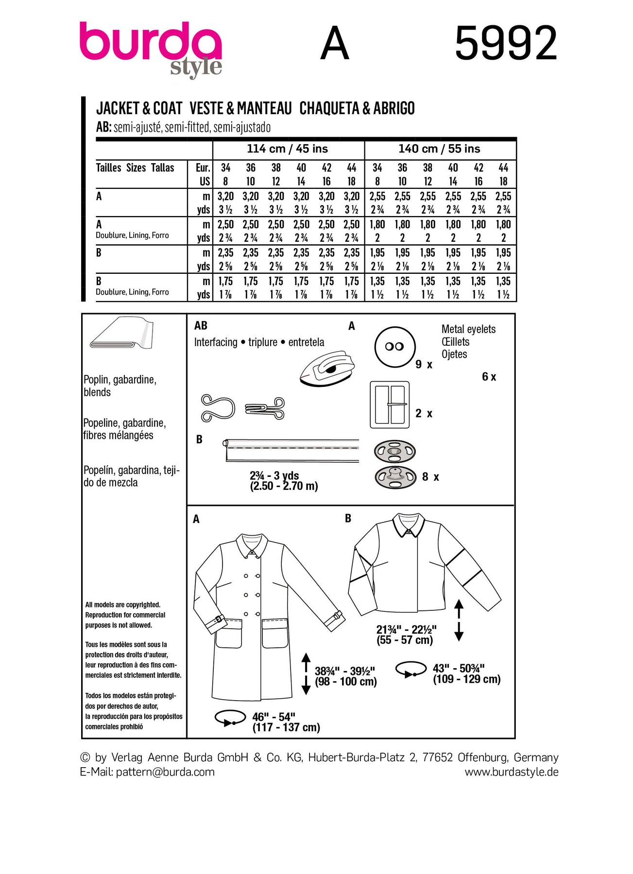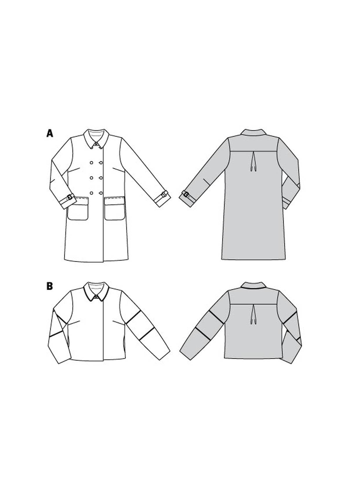 Stoffempfehlung:Popeline, Gabardine, Mischgewebe AB: Aufbügelbare Einlage, Haken und Öse zum Annähen. A: 9 Knöpfe, 6 Ösen zum Einnieten, 2 Schließen mit Dorn. B: 8 Druckknöpfe zum Annähen, Paspelband: 2,50 - 2,70 m