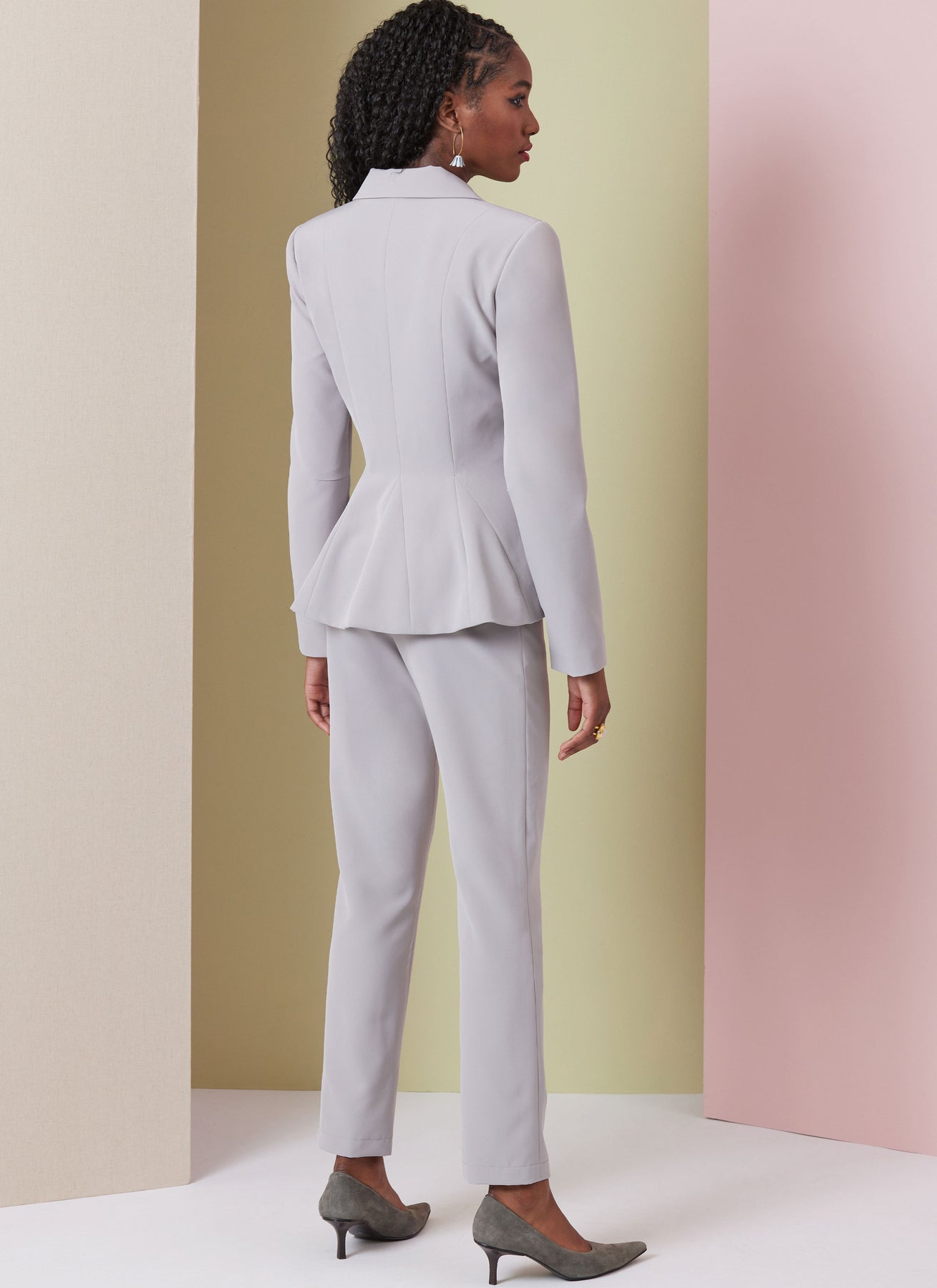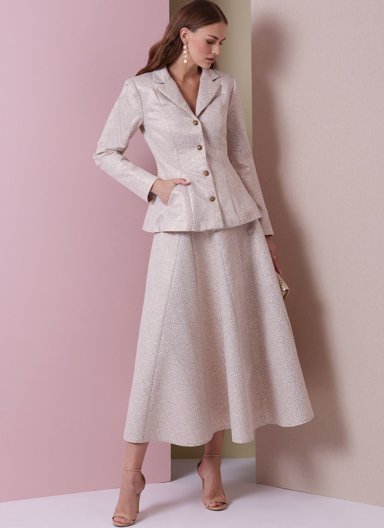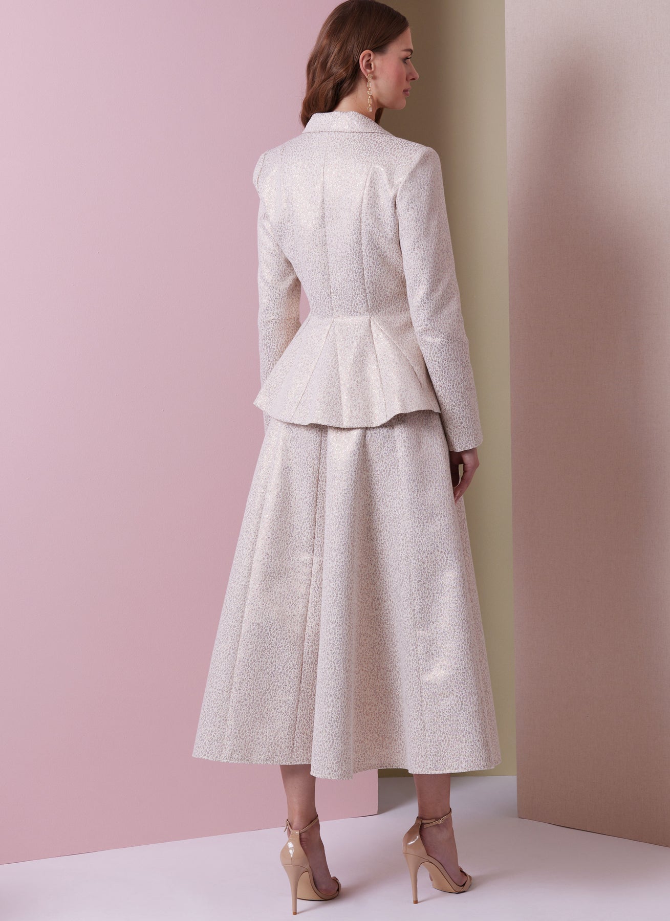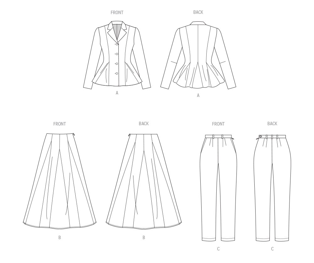 Die taillierte, gefütterte Jacke mit Schößchen hat einen Knopfverschluss vorne, einen gekerbten Kragen, Godets und Taschen vorne in der Naht. Rock B hat Taillenbesätze, seitliche Vorder- und Rückennähte, vordere und hintere Mittelnähte mit Godets und einen unsichtbaren Seitennahtreißverschluss. Konisch zulaufende Hosen (hüftlang) haben einen seitlichen Knopfverschluss, schräge Taschen und einen unsichtbaren Seitenreißverschluss.