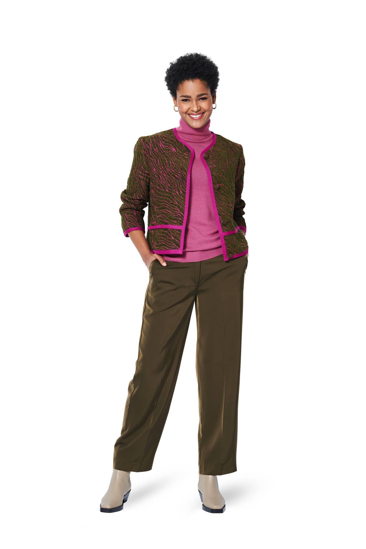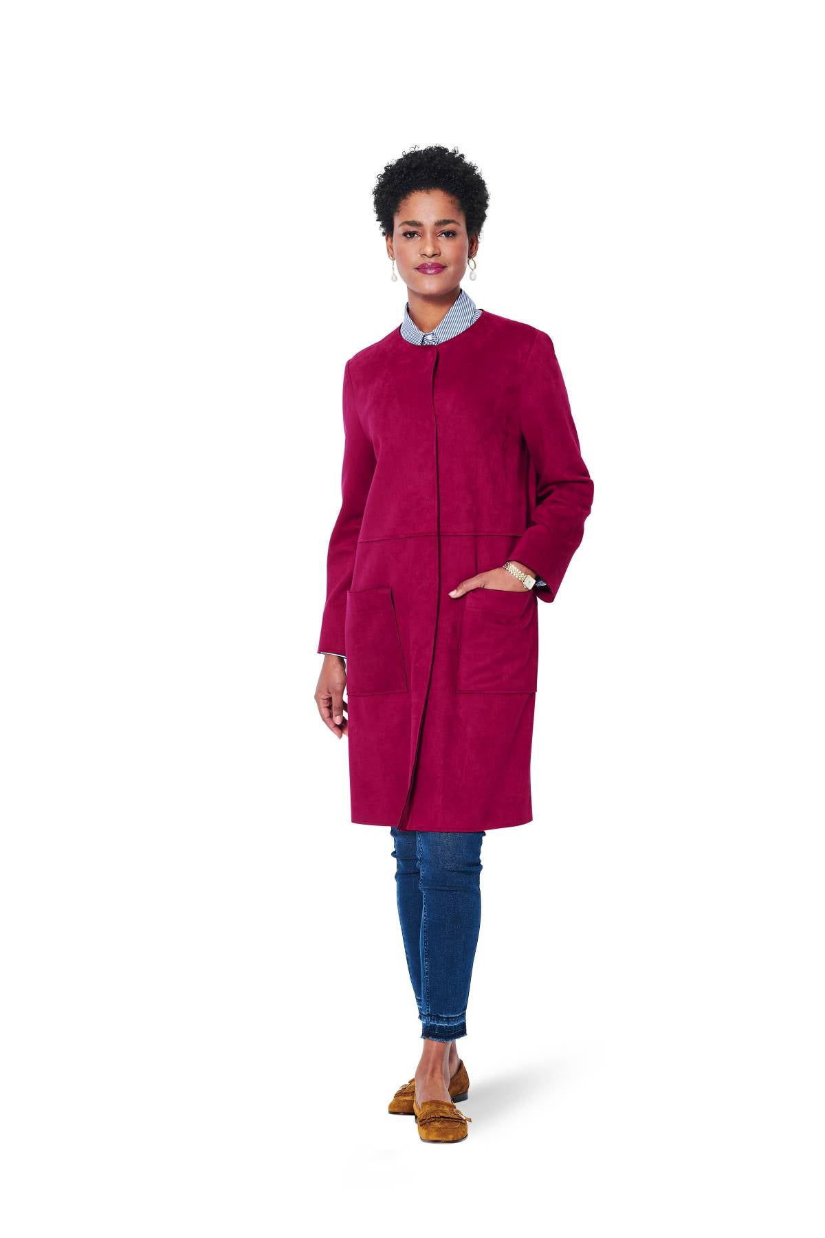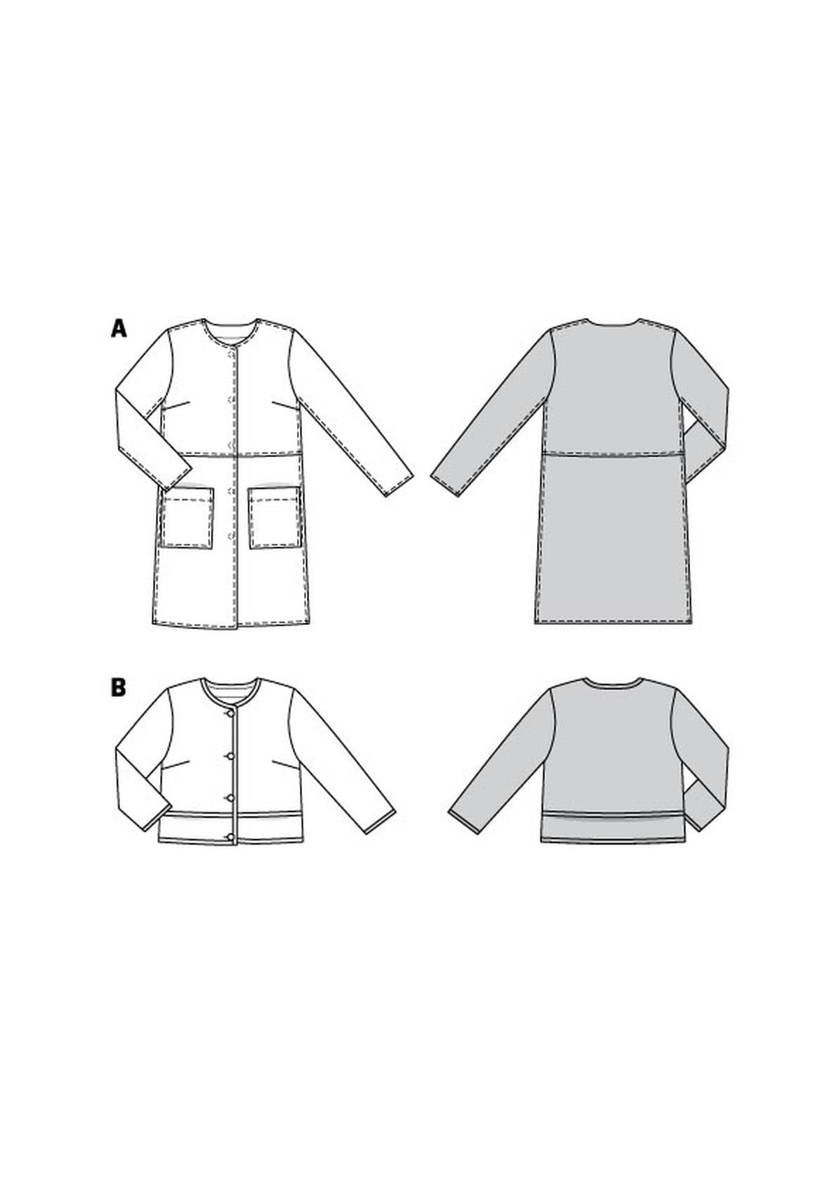 Ideal für die Übergangszeit ist dieser kragenlose knielange Mantel mit aufgesetzten Taschen oder das kurze kastenförmige Jäckchen mit eingefassten Kanten. Beide Modelle sind ungefüttert und ideal um üppige Tücher oder Schals in Szene zu setzen.