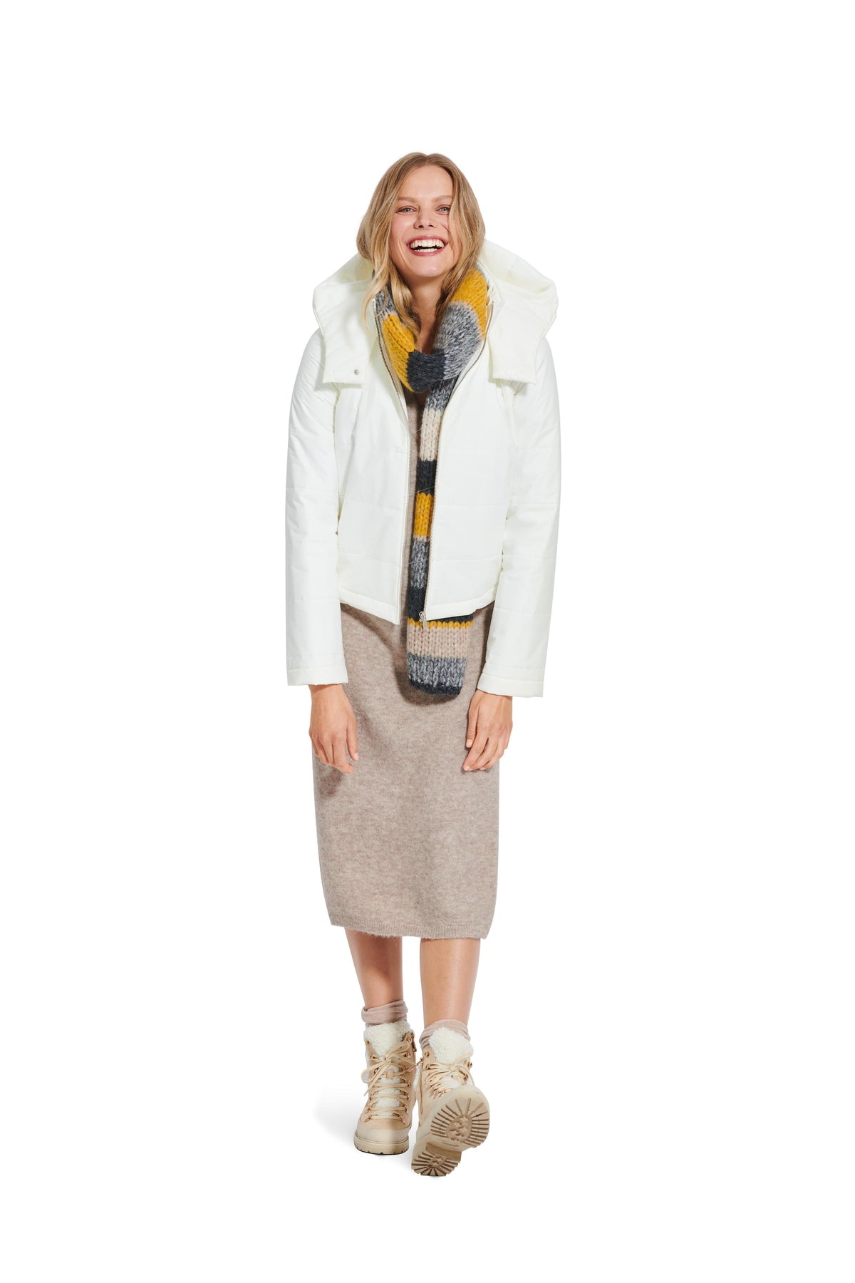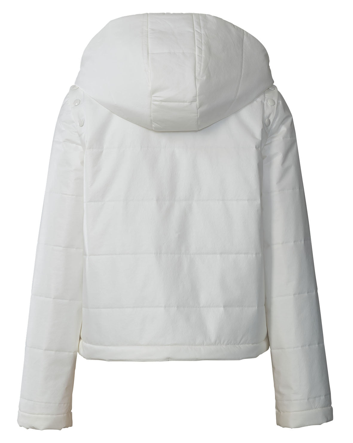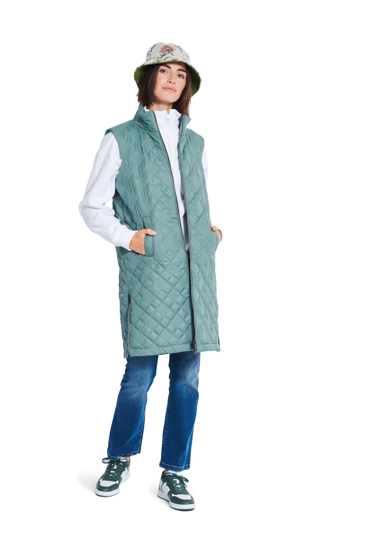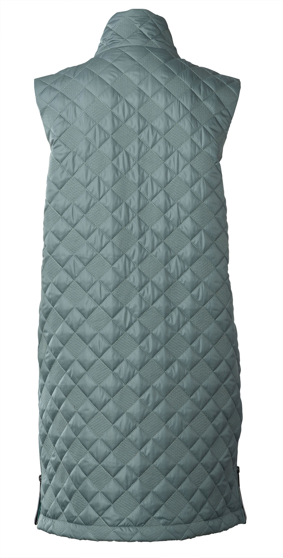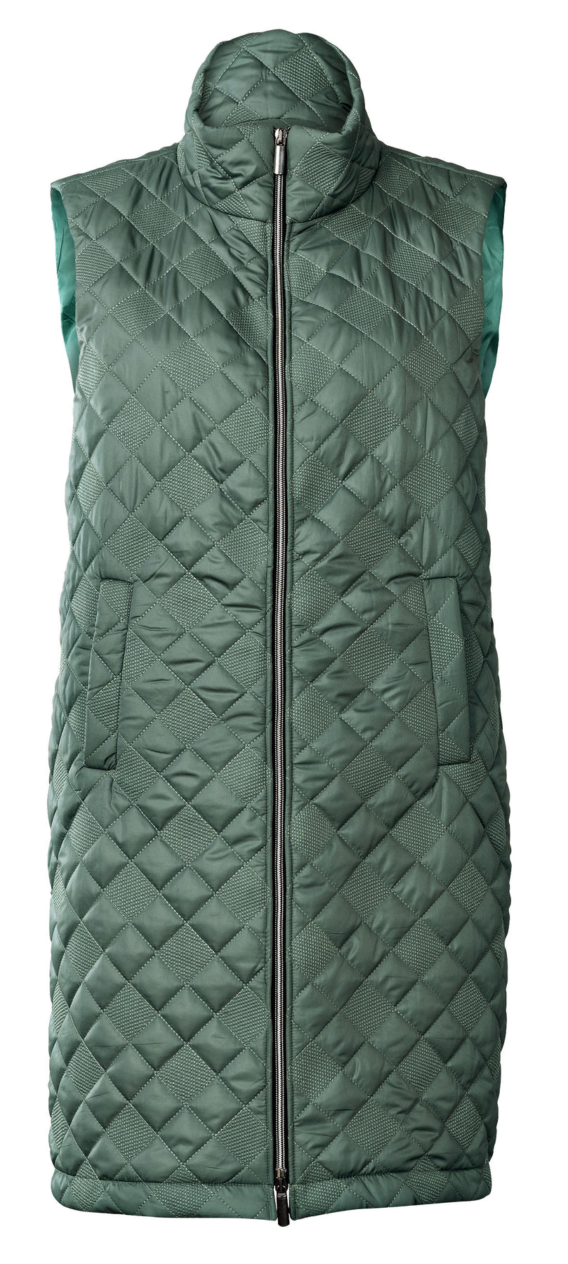 Lange Steppwesten sind der Modehit, hier mit Pattentaschen, Stehkragen und seitl. Schlitzen mit Reißverschlüssen. Die Jacke mit Stehkragen und Kapuze wird schnell zur ärmellosen Weste, die Ärmel sind einfach abknöpfbar.