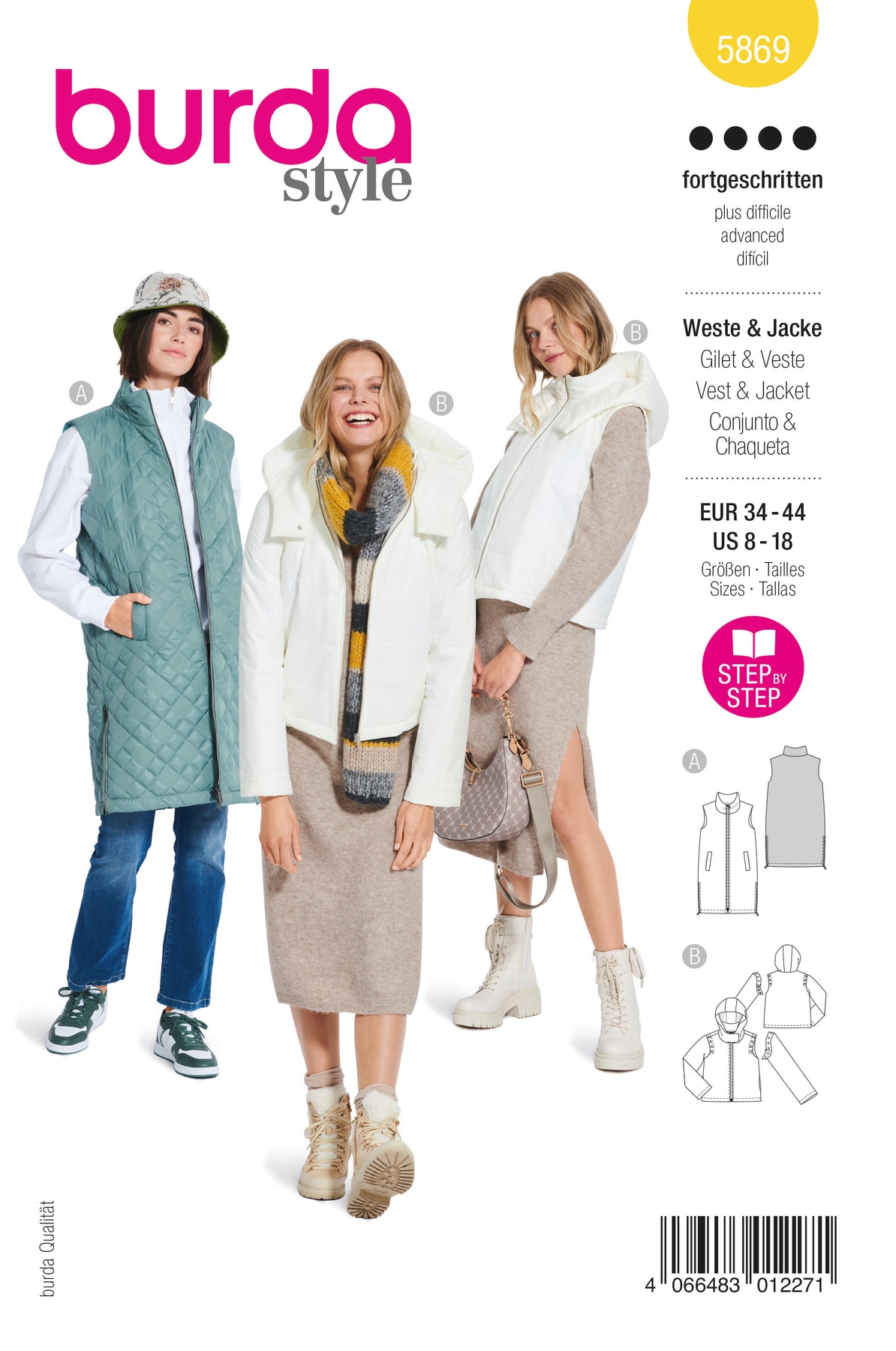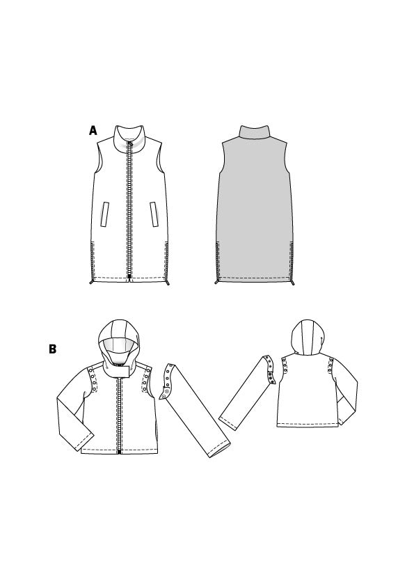 Stoffempfehlung:Steppstoffe, Funktionsstoffe AB: Aufbügelbare Einlage. A: 1 teilbarer Reißverschluss, 90 cm lang, 2 Reißverschlüsse, 25 cm lang. B: 1 teilbarer Reißverschluss, 60 cm lang, 10 Druckknöpfe zum Annähen, 16 Druckknöpfe zum Einnieten