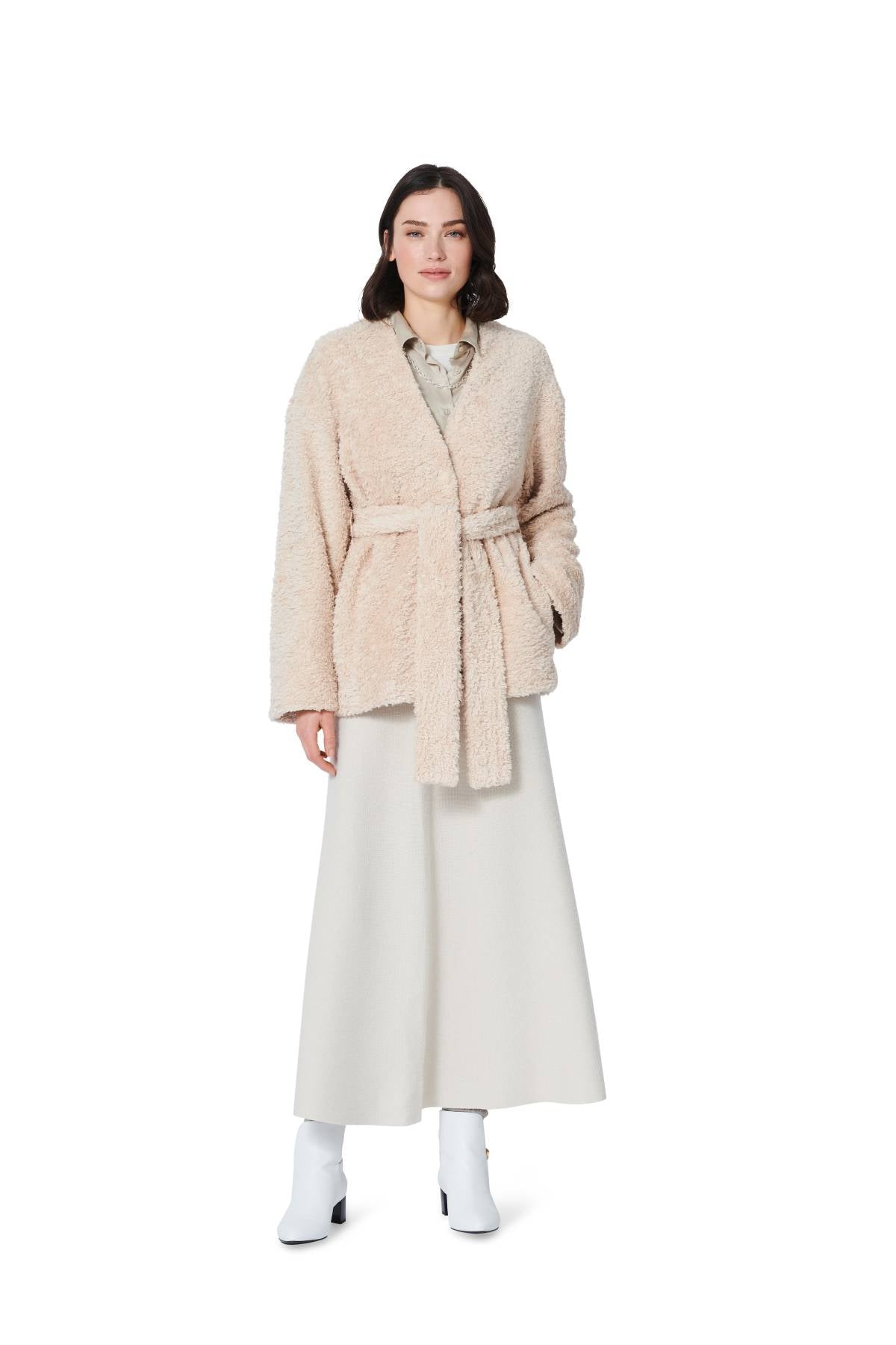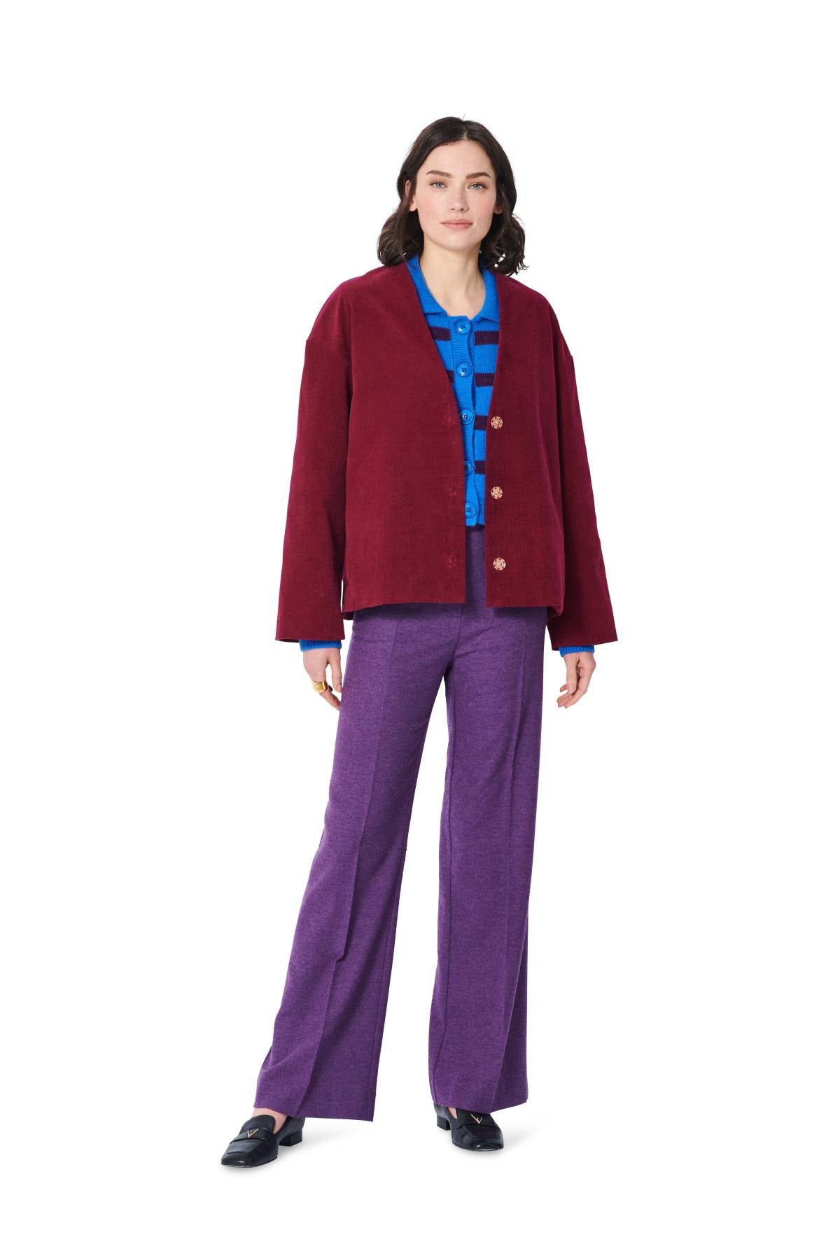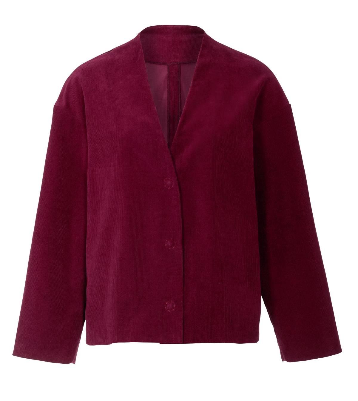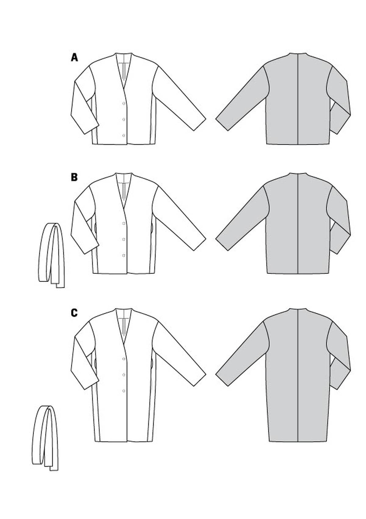 Zwei Jacken und ein Mantel, lässig zu tragen, vielfältig zu kombinieren. Einfach kragenlos, am Halsausschnitt etwas erhöht mit überschnittenen Schultern, vord. Teilungsnähten und Nahttaschen.