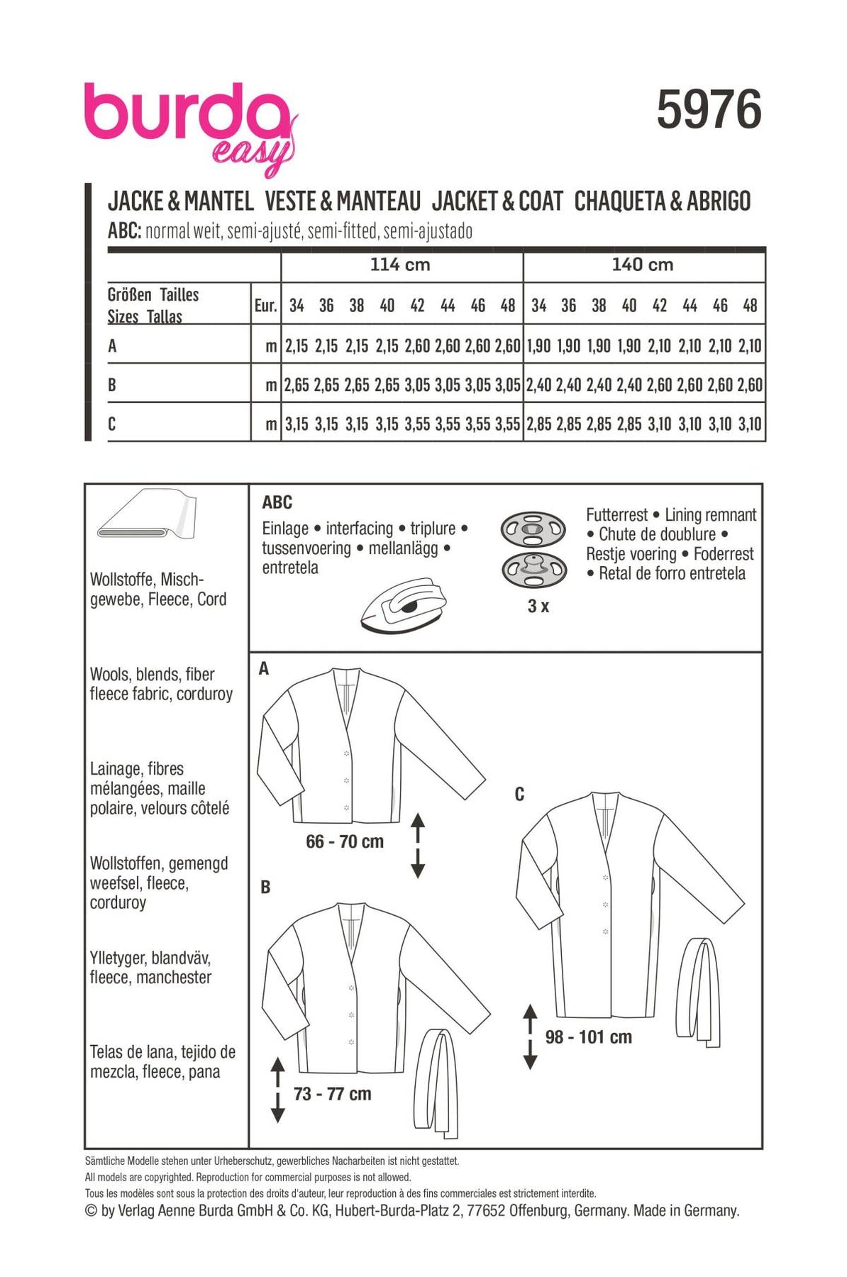 Stoffempfehlung:Wollstoffe, Mischgewebe, Fleece, Cord ABC: Aufbügelbare Einlage, 3 Druckknöpfe zum Annähen, Futterrest für Taschenbeutel