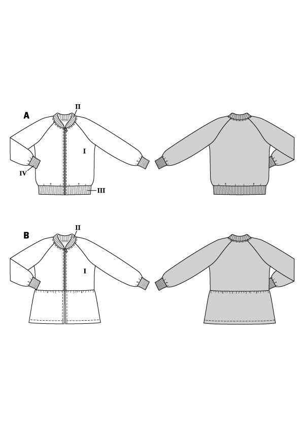 Stoffempfehlung:Sweatshirtstoffe, Jersey, Bündchenware A: 1 teilbarer Reißverschluss, Gr. 104: 35 cm, Gr. 110 - 122: 40 cm, Gr. 128 - 140: 45 cm, Gr. 146: 50 cm. B: 1 teilbarer Reißverschluss, Gr. 104 - 122: 20 cm, Gr. 128 - 140: 25 cm, Gr. 146: 30 cm.