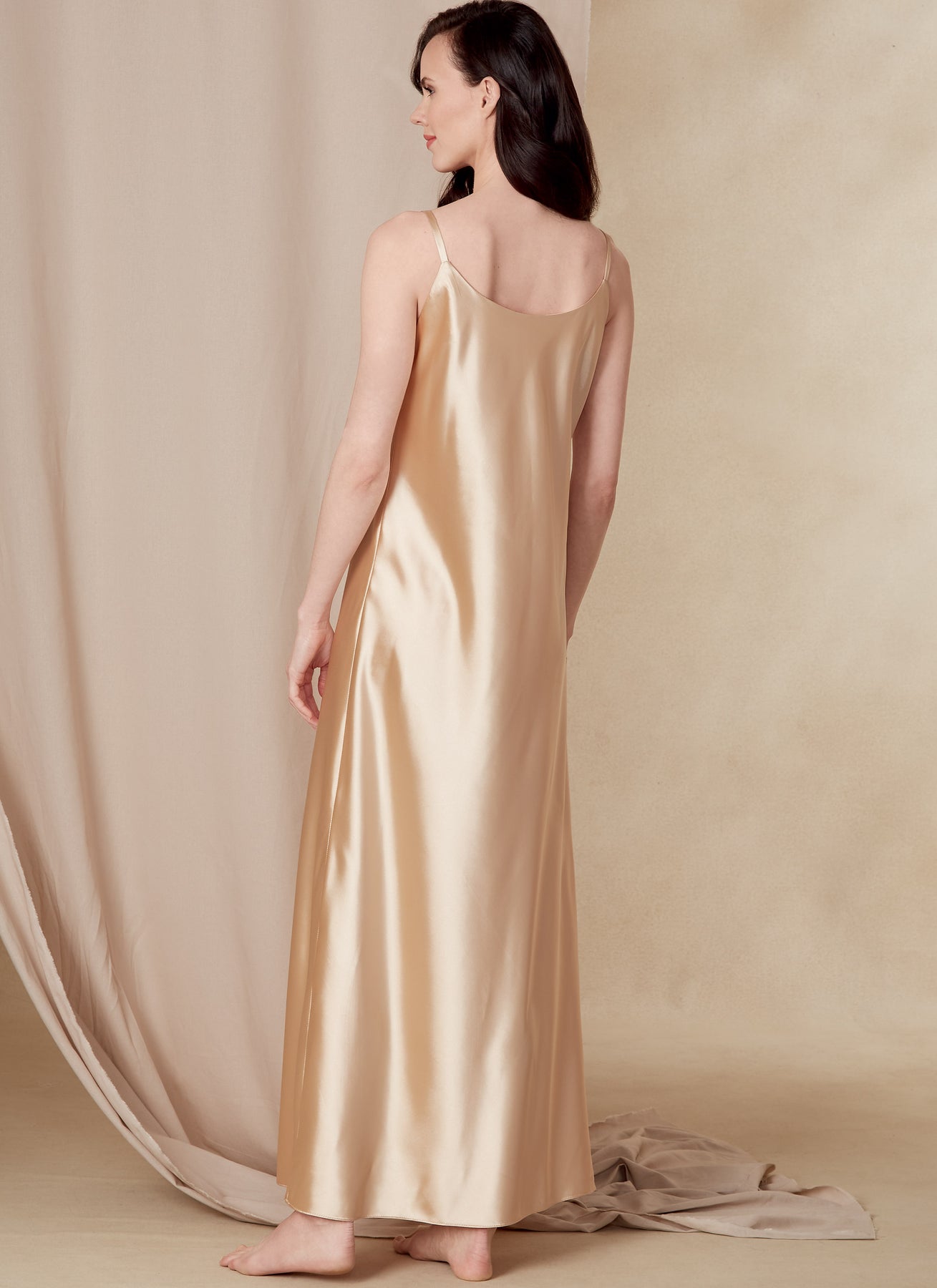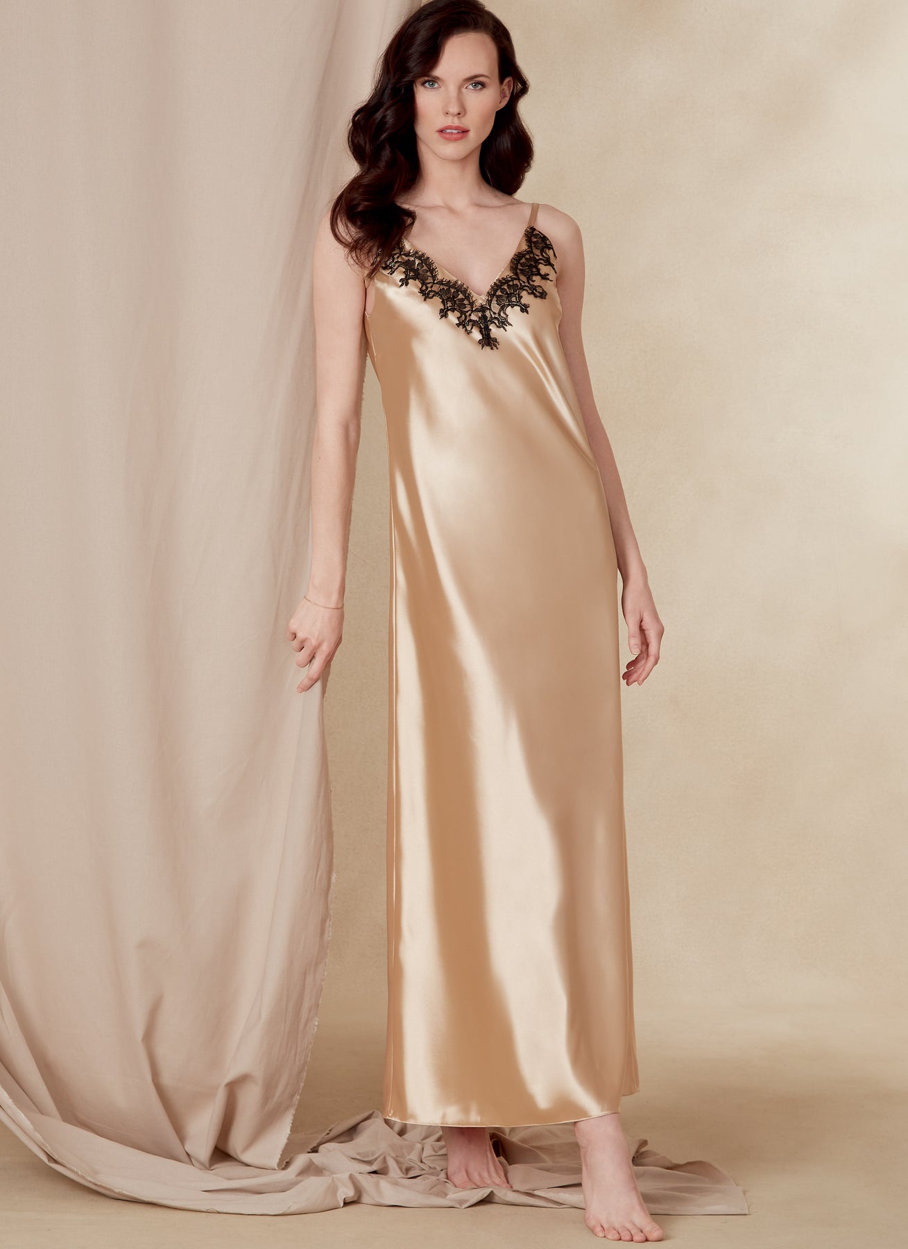 Locker geschnittener Wickelmantel für zierliche Damen mit Raglanärmeln, Seitennahttaschen, geformtem Nackenband, Gürtel und Schlaufen. Camisole und Slip haben schmale Schulterträger, Hals- und Armausschnittblenden, Spitzenbesatz. Schräg geschnittene, eng anliegende Shorts mit elastischem Bund. Elastische Hosen mit halber Passform und Taille. A, B, C, D, E: aufgesetzte, gekaufte Verzierungen.