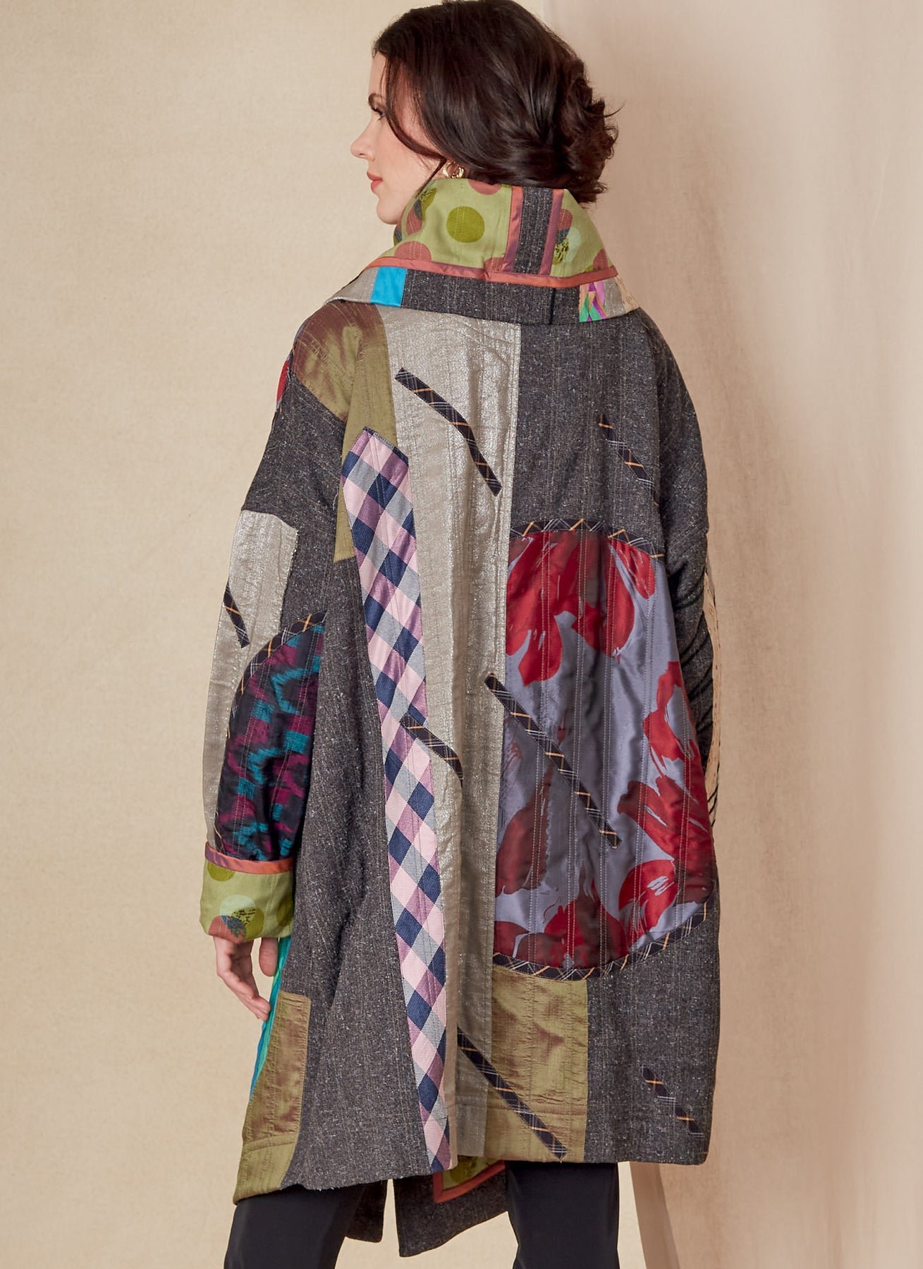 Sehr locker sitzender, wendbarer Mantel mit übergroßem Trichterkragen, überschnittenen Schultern, Seitentaschen und Applikationen aus kontrastierenden und wiederverwendeten Herrenkrawatten.